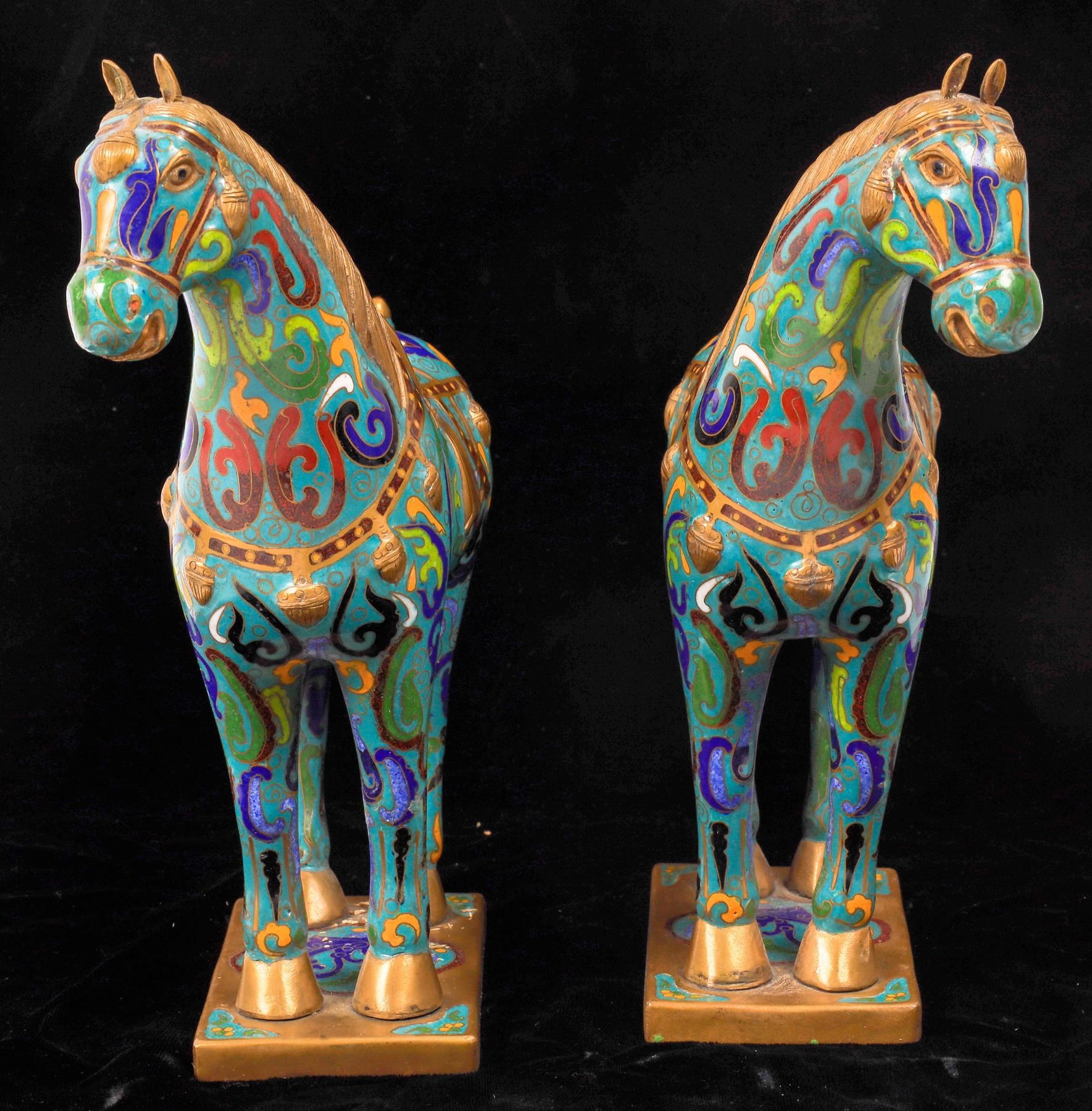 Pair Chinese cloisonne enamel brass horse sculpture, probably mid 20th century. Brass sculpture finished in turquoise enamel with vibrant traditional cloisonne motifs. Areas of exposed brass is shown along the hoofs, mane, head and saddle. Each 9.5"x 9"x 3".