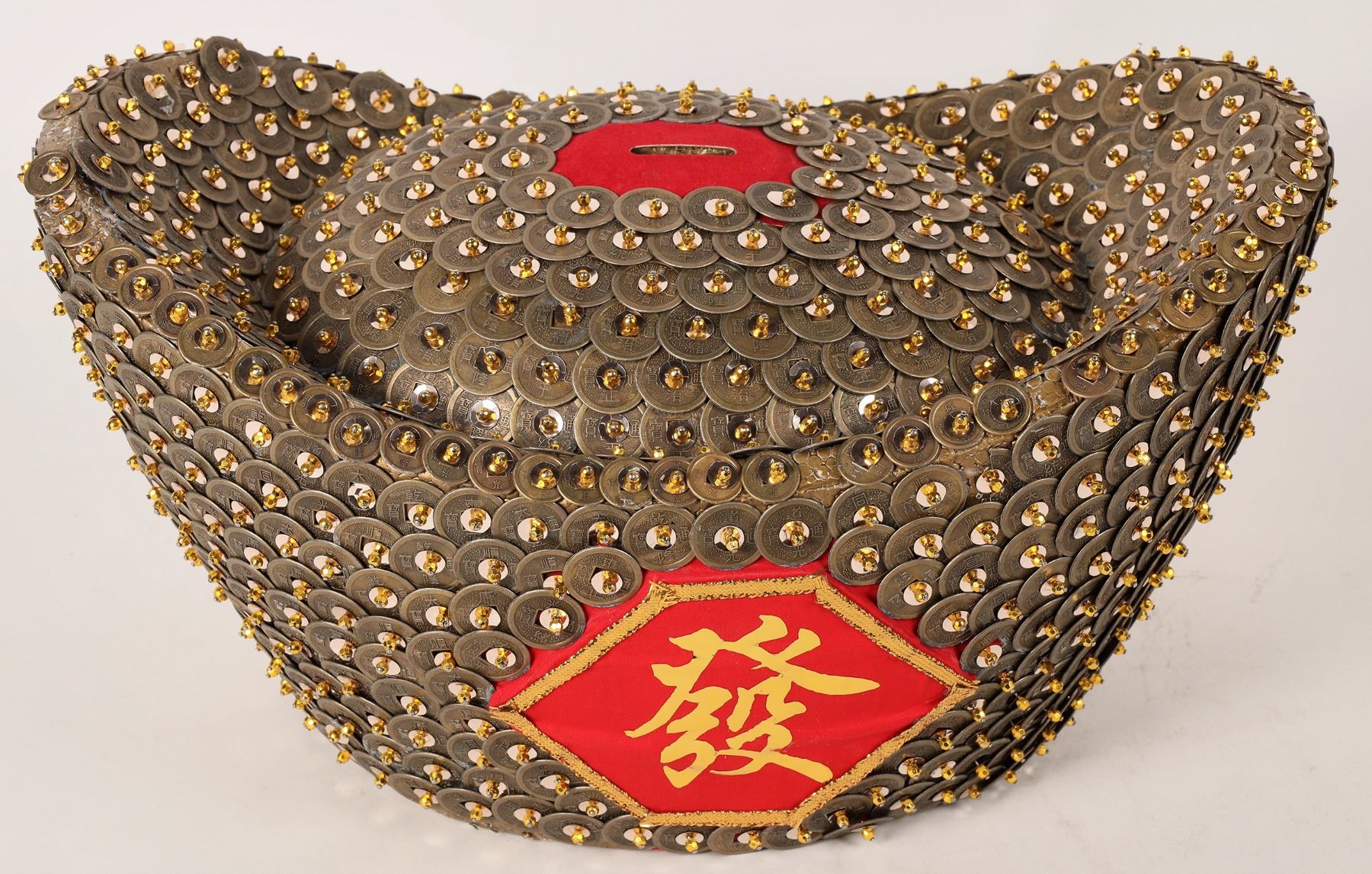 Chinese money bank constructed of original Chinese coin in the shape of the ancient boat money (which were silver and gold ingots). (yuan bao or sycee in Chinese). Brass colored coins pinned to the hull of the ship. 13 inches wide, 10 inches tall. Chunlin Zhu Collection