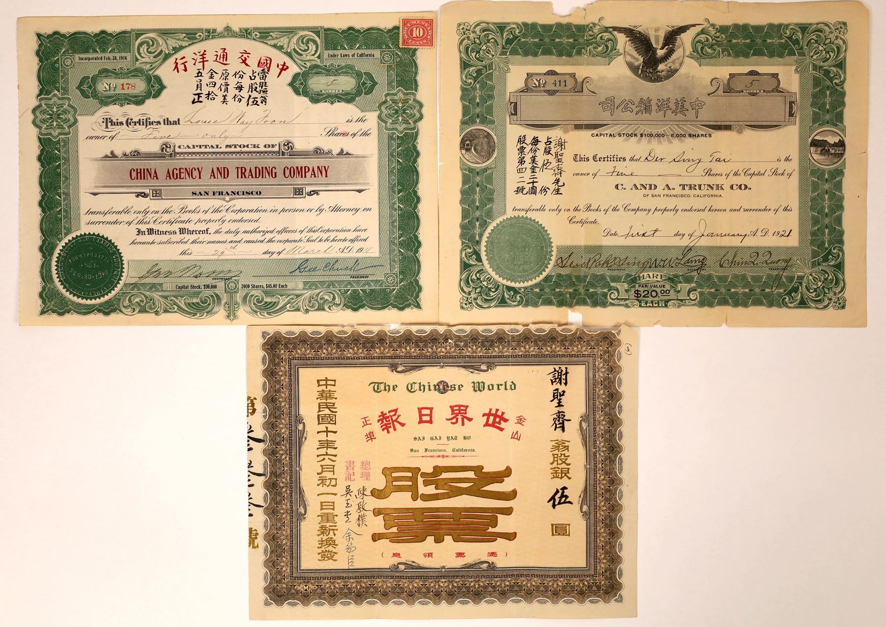 Three Chinese companies' stock certificates, from San Francisco, Calif., issued in the early 1900s. The first is a certificate for The Chinese World, colorful with ornate border and seal embossed San Francisco and "Sai Can Eat Bo Pub. Co." Measures approx. 10.5" x 8", date not in English, good condition with several light folds and slight tear top right. Also included are: China Agency and Trading Company, San Francisco, issued in 1918, signed by President and Secretary, very ornate with green embossed seal, two revenue stamps, 11" x 8.5", excellent condition with two light folds; and C. and A. Truck Co., San Francisco, issued in 1921, signed by President, Secretary and Treasurer, vignettes of eagle and two small scenes, ornate border and seal embossed "Manufacturers and Dealers of Trunks and Bags," 11.5" x 9", fair condition with folds, small tears and repairs.