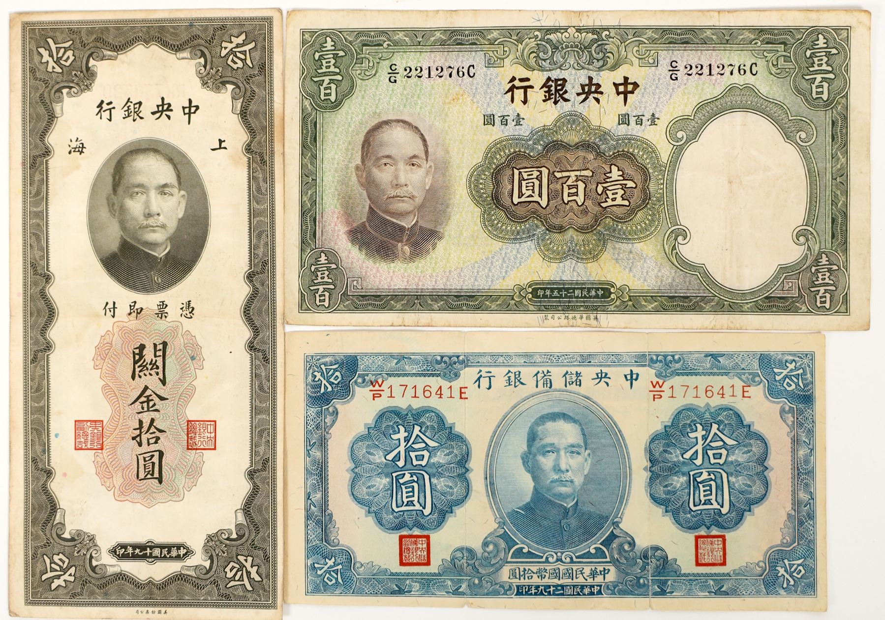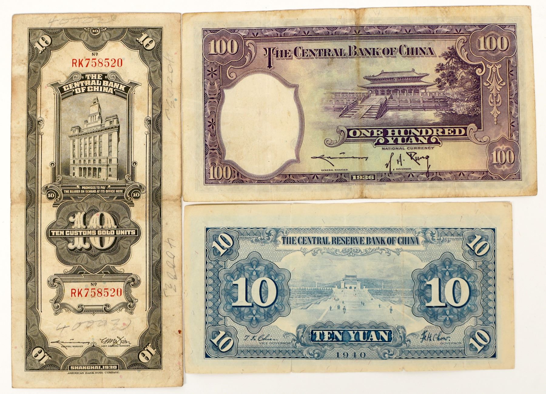 Lot of three: 1) 100 Yuan, 1936; 2) 10 Yuan, 1940; 3) 10 Customs Gold Units, Shanghai, 1930. All fine to extra fine.