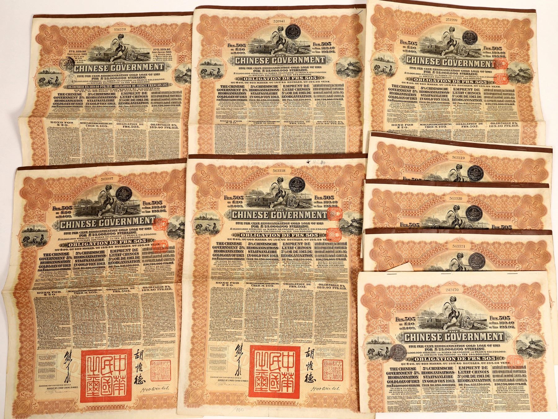 Nine pieces, industrial vignette at top with Greek allegorical figure, Chinese rice field at left temple at right. 5% reorganization Gold loan of 1913 for £25 million coupons attached some with British revenues others without some with French revenues.