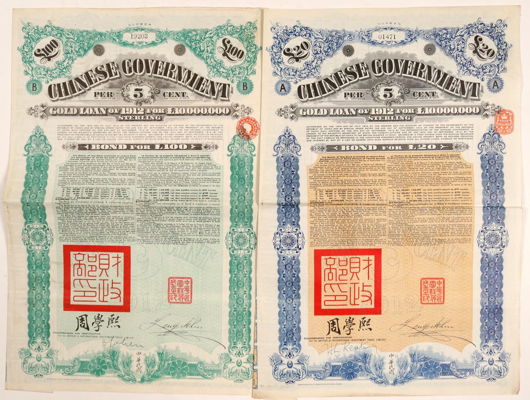 Pair of Chinese Gold Bonds, 1912. The $100 bond has a PACSO certificate D16201. 5% Gold Loan of 1912 series. excellent condition.