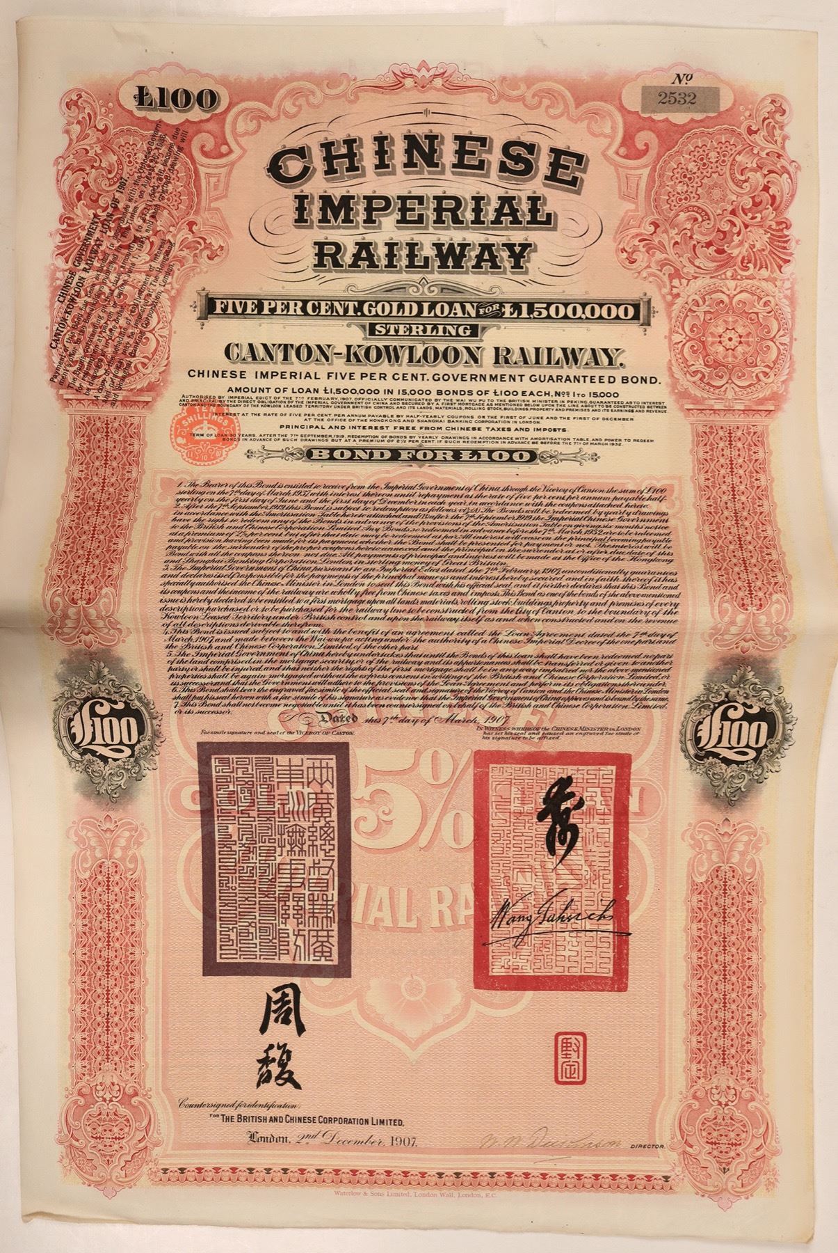 Dated 1907, Issued and Uncancelled. Government guaranteed. Handsigned by the Director. Also included is a partial sheet of coupons: 18 coupons and one talon. British and Chinese Corporation Limited. Vignette of two chops. Extremely fine, with just a staple hole in the upper left. NO RESERVE