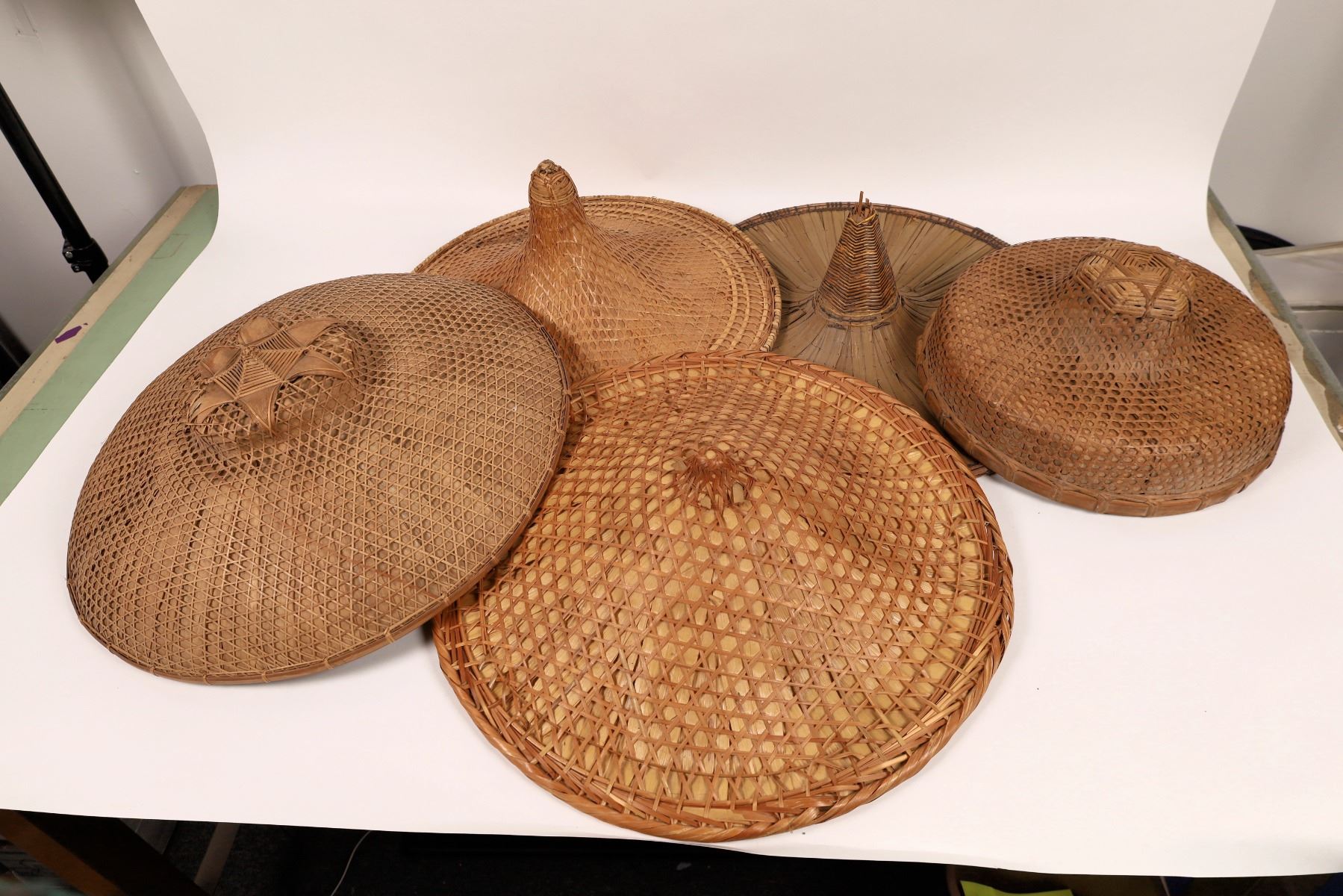 Five Asian style, possibly Chinese hats. A) 19.5" diameter, 9" high at tall point, constructed of equivalent of palm leaf fibre; 21" diam, 8" tall, more delicate construction with broad top with pyramid, some damage to this area., same material; 14" diam, 8" tall, broad circular top, less intricate than last, but better construction along base; 20" diam, 9" tall, single high point similar to a cone shape, damage at top. This hat appears older than the rest, made with three different materials, a red-brown much like bracken fern, a palm leaf- like material, and a lighter colored material, possibly bamboo. some damage to rim. The last hat about 20" diam, 6" tall with a broadly sloping top leading to a single top. The palm material has been lacquered. These hats are very reminiscent of our Chinese heritage in the West, particularly California and Nevada. Date: Country (if not USA): State: California City: Provenance: