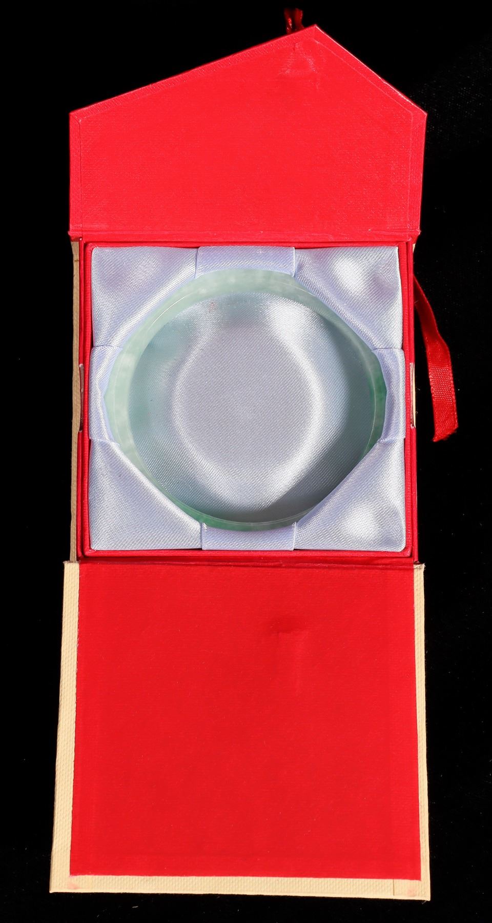 Pale green jade bracelet from China. It measures 3" in diameter & is in new condition, with gift box. Please see photos for more details.[ China Chunlin Zhu Collection