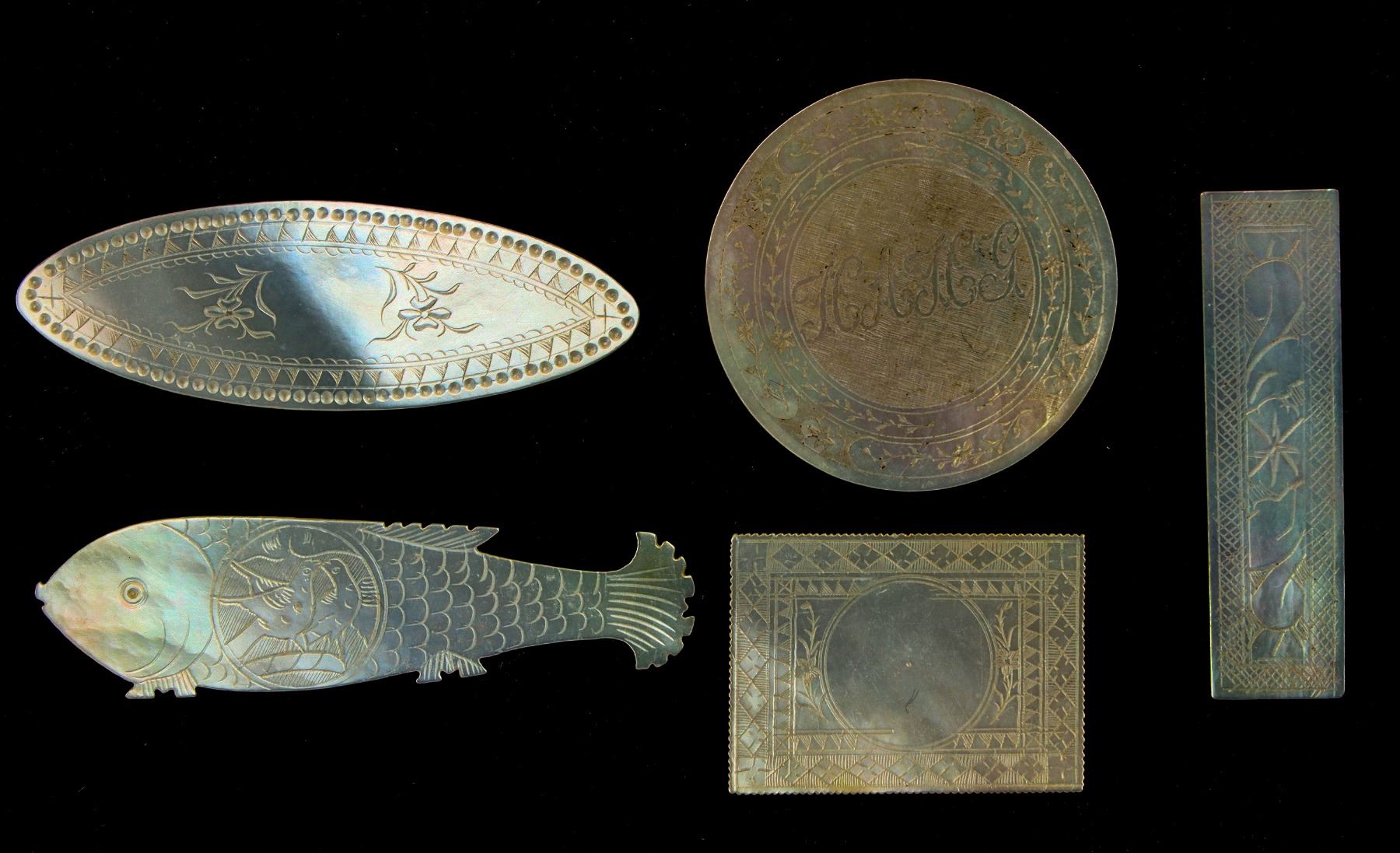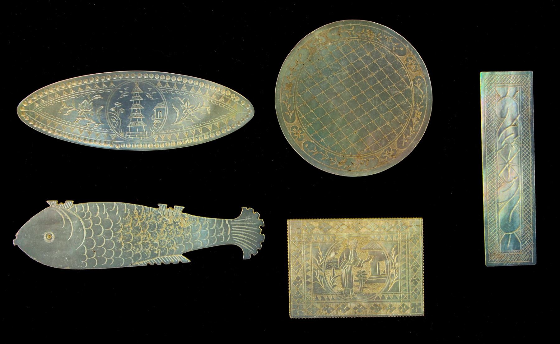 Chinese Mother of Pearl Gaming Tokens. Here are five examples of pre-1840 Chinese mother-of-pearl gaming counters: round, oval, rectangle, long rectangle and a fish. These first came to Europe around 1700 when European traders were answering the demand for tea. An enterprising trader must have seen the Chinese gambling with simple, yet fine mother-of-pearl counters decorated with traditional Chinese designs and brought some back to Europe. They quickly became collectibles, but the cost of a set of counters was huge, so it was only the very richest families which could afford them. Eventually demand seems to have stopped in around 1840 when social habits in Europe were moving away from card games which required counters. The production of these counters in China finally came to an end. Douglas McDonald Collection.