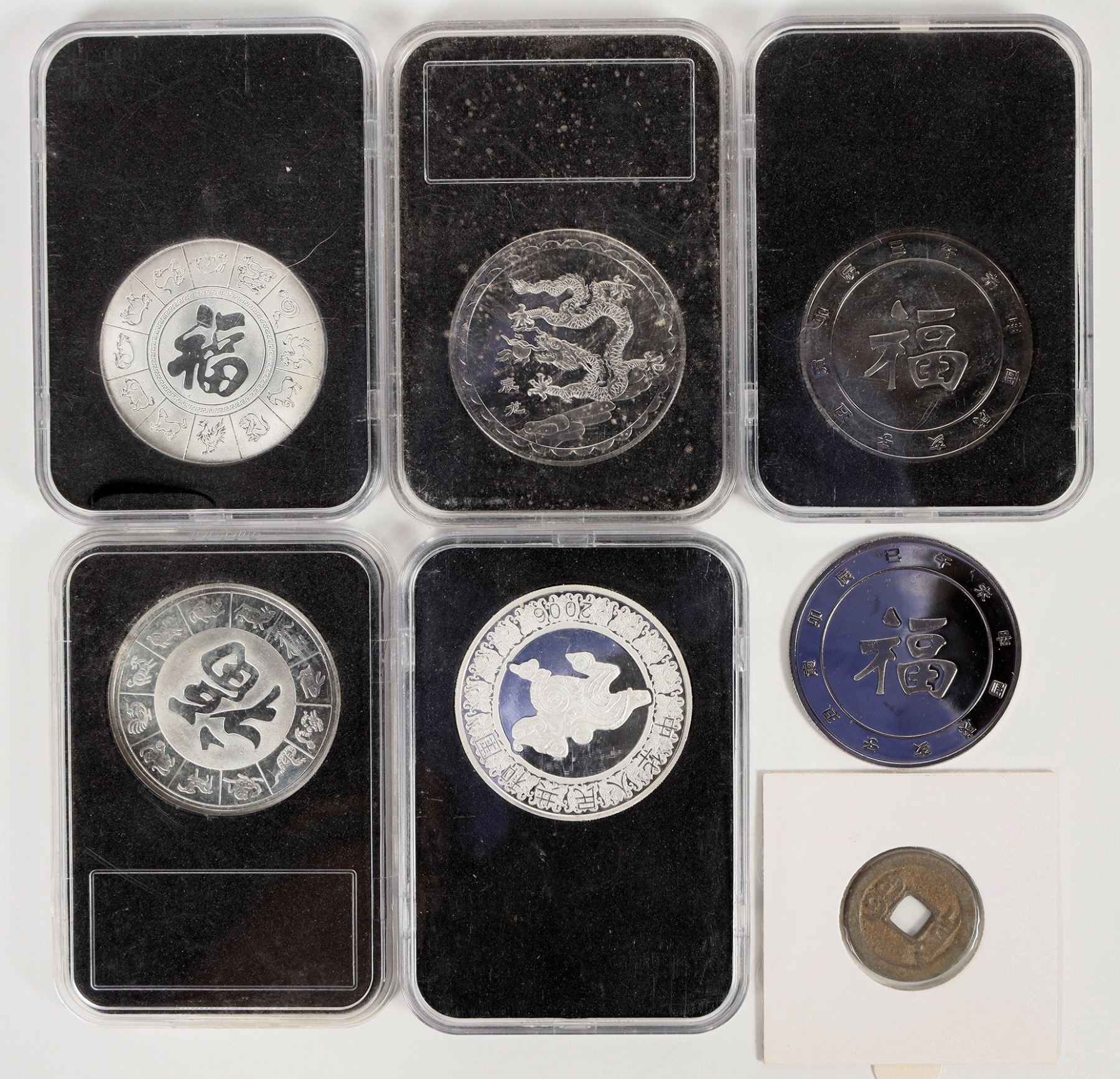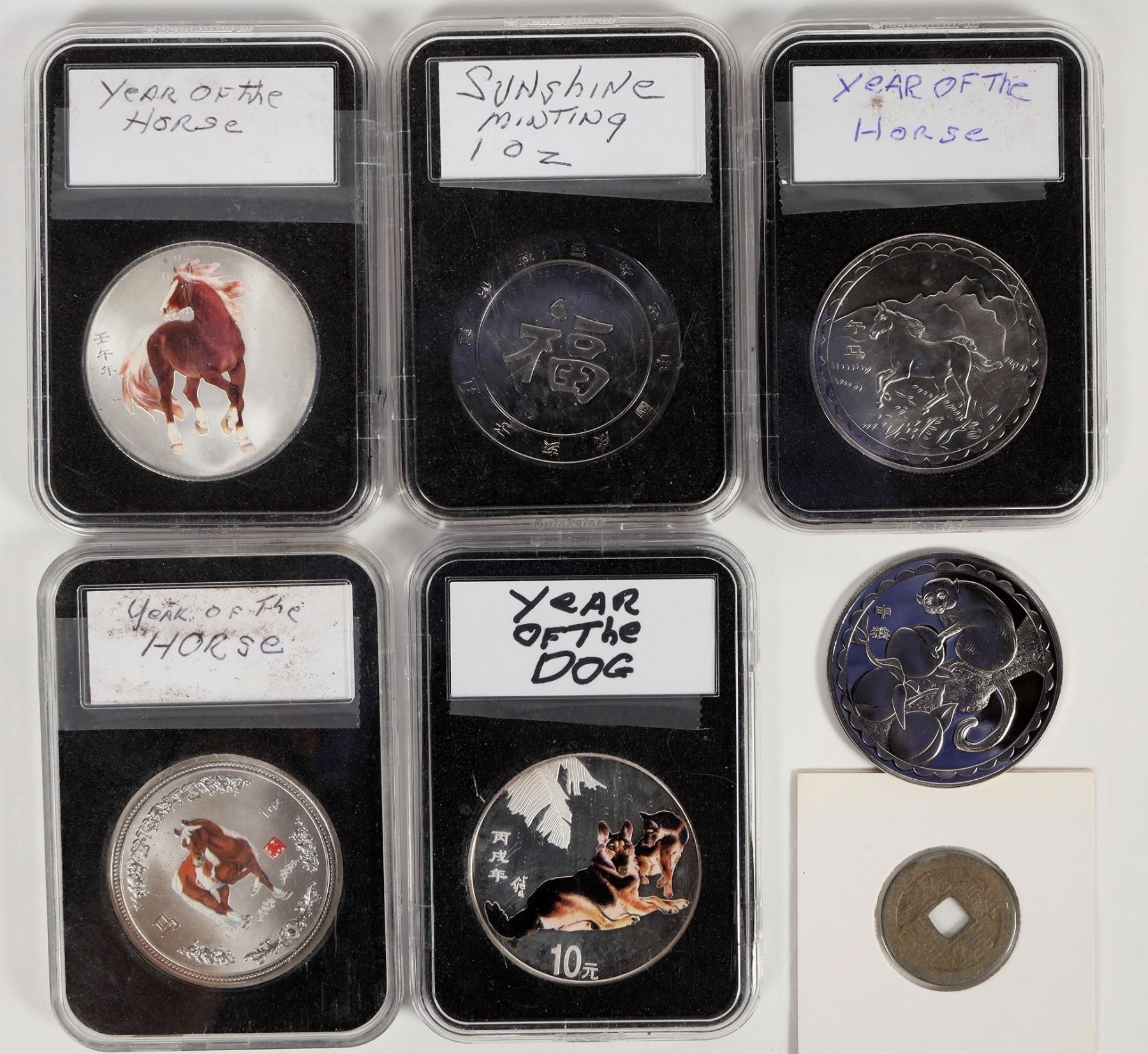 Six white metal medallions from lunar new year: Year of the Dog, Year of the Horse (3), Year of the Dragon, Year of the Monkey. None are marked silver. Also a Qing Dynasty Cash coin with certificate of authenticity.