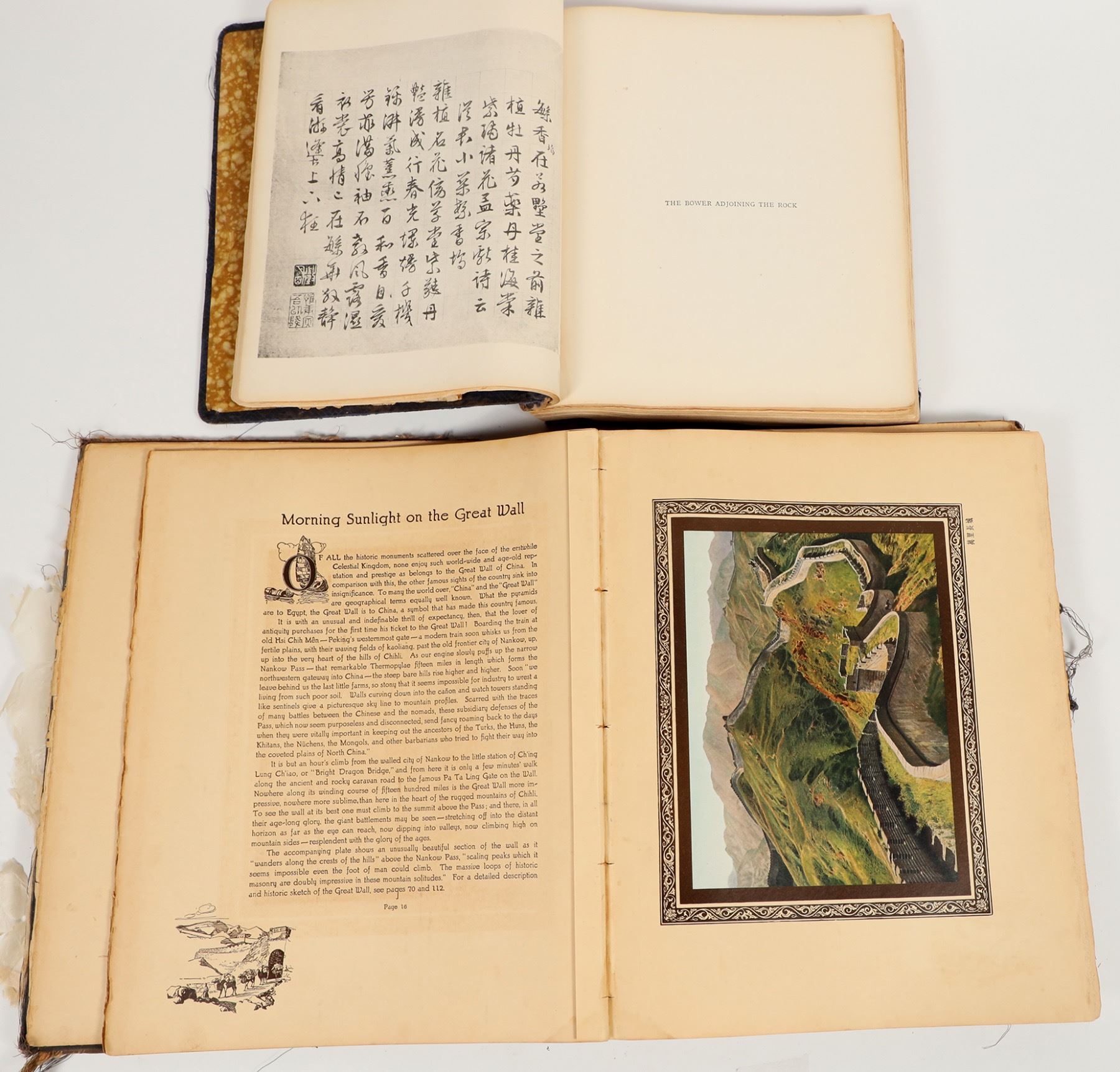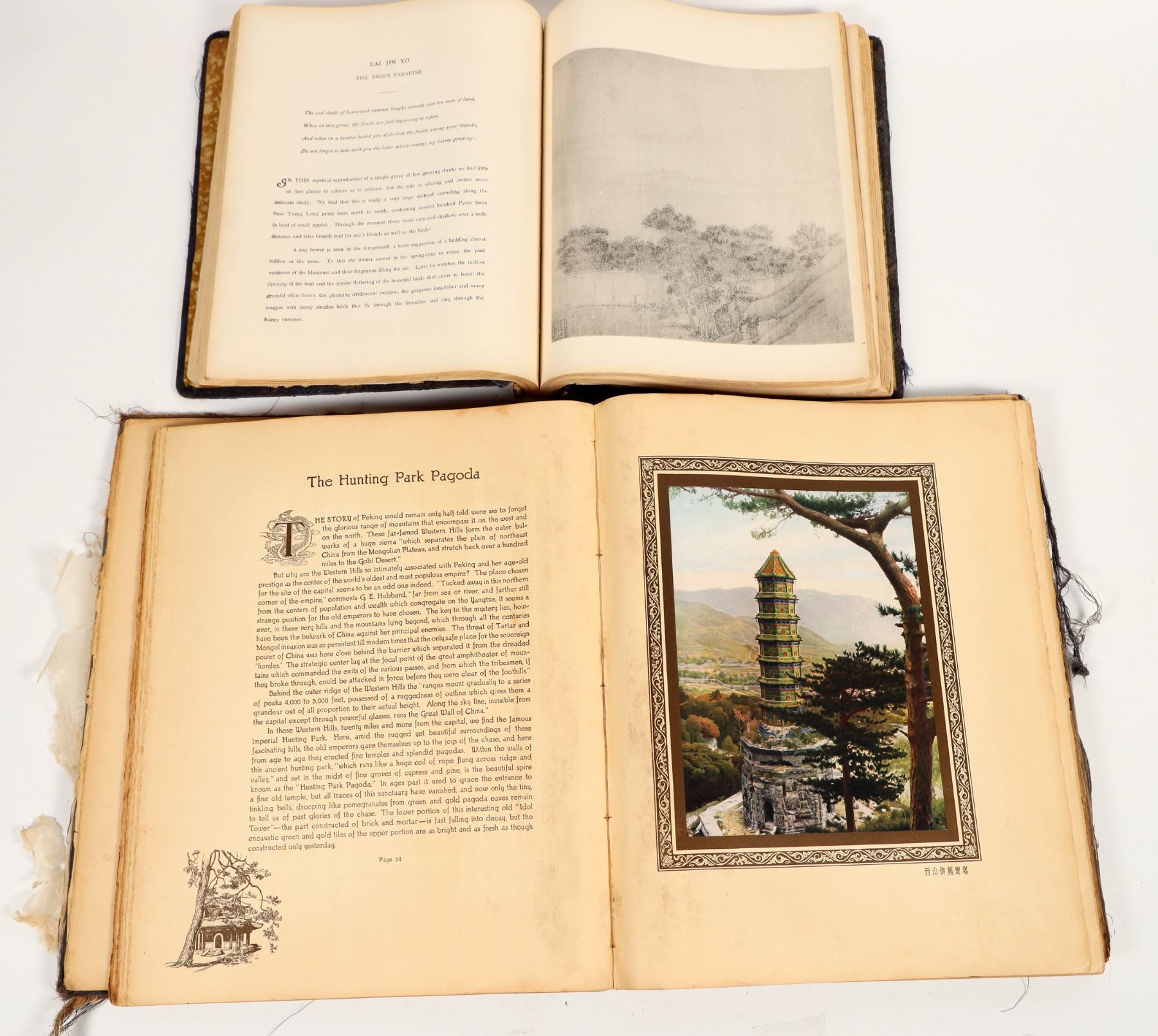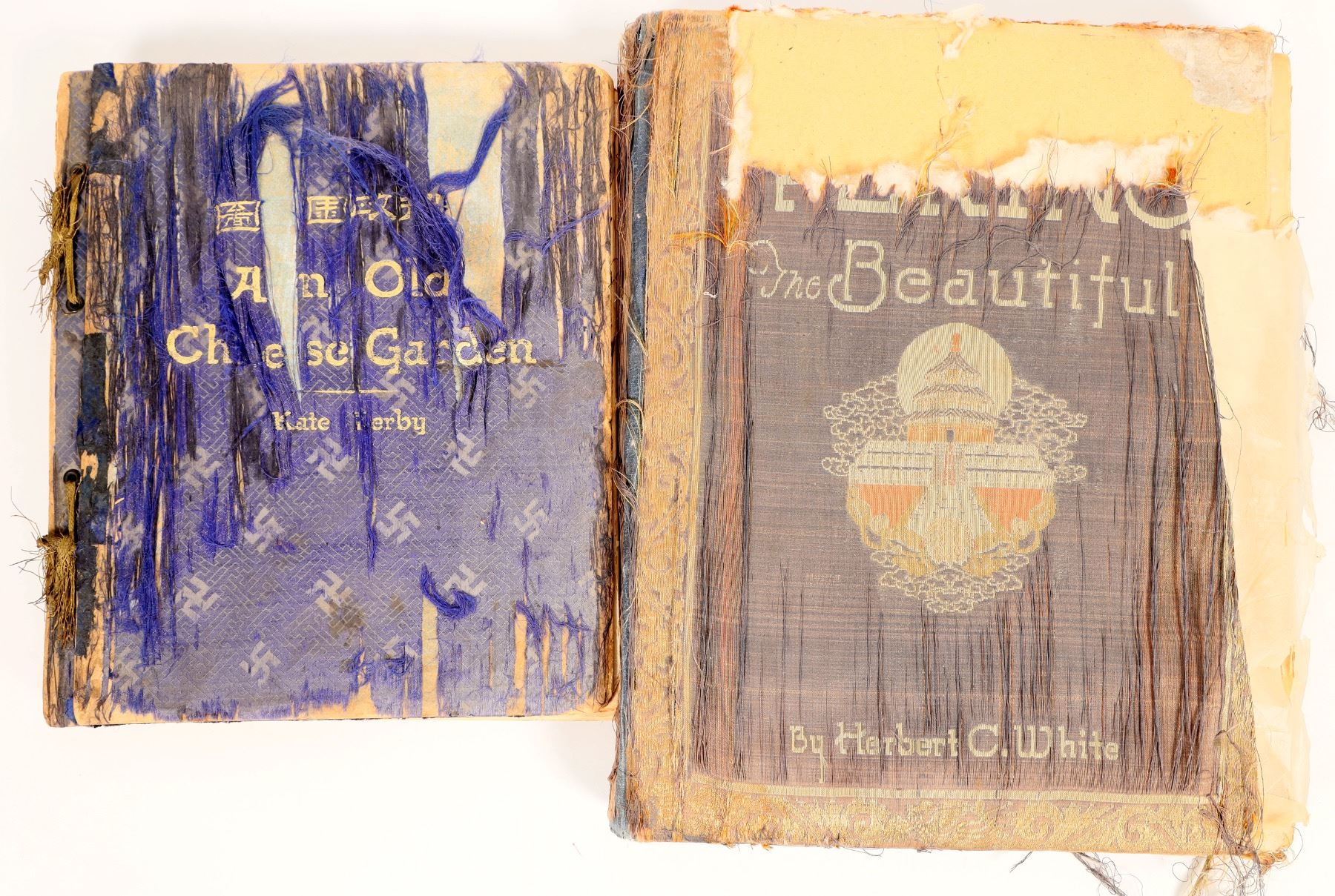 Comprising seventy photographic studies of the celebrated monuments of China's northern capital and its environs complete with descriptive and historical notes by Herbert C. White, Art Director, Signs of the Times Publishing House, Shanghai. Introduction by Hu Shih, Ph. D., formerly Professor of Philosophy at the National University University of Peking. White dedicated the book, "To All Lovers of China's Glorious Artistic Heritage" and expressed sincere thanks to Princess Der Ling for her preparation of the captions of the book which she transcribed from the expertise of the Empress Dowager in the Forbidden City. 1920s China was a period particularly marked by the emergence of photographically illustrated publications dedicated to famous places. As is stated in the book's preface: “The very fact that so many of the ancient landmarks (...) are being torn from their foundations and ruthlessly destroyed, makes an album of this kind not only interesting as an art volume, but a work of immeasurable value to China and to the world, as an authentic record of picturesque Peking." Folio, original embroidered silk pictorial boards. Contains 70 photographic plates mounted, numerous illustrations in text. Rare and desirable publication in poor condition. Professional restoration recommended. In better condition this book sells for over $10,000. See Photos.