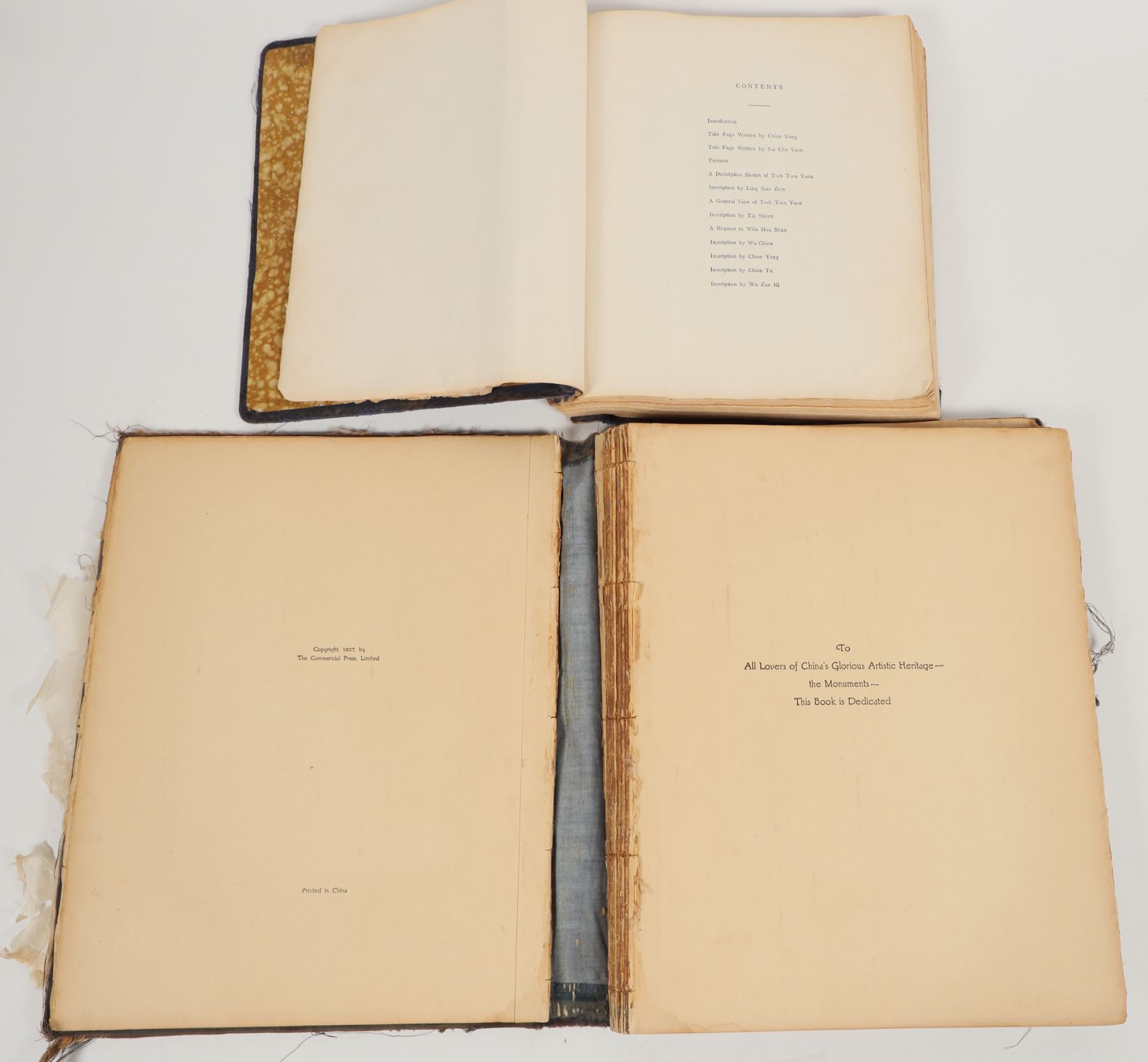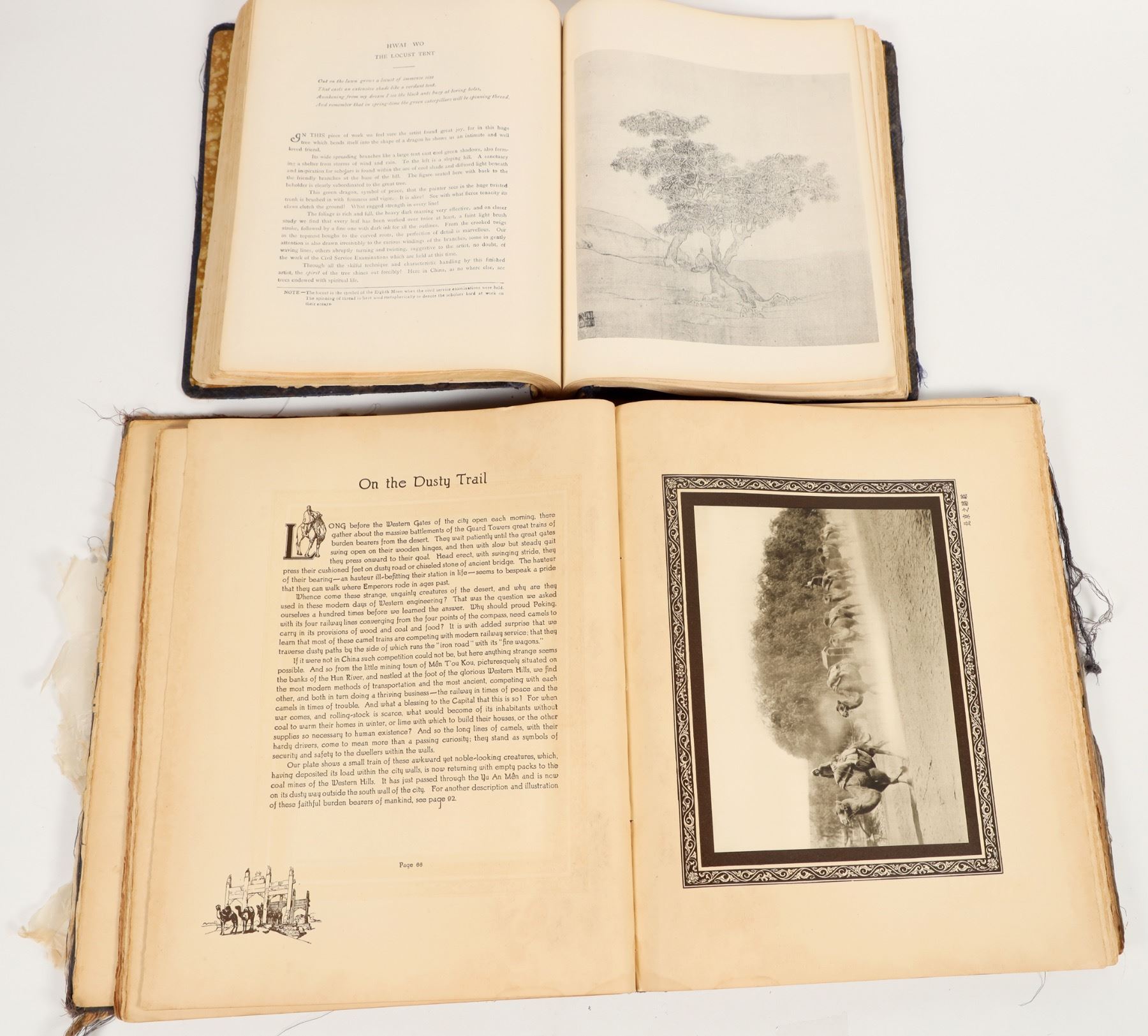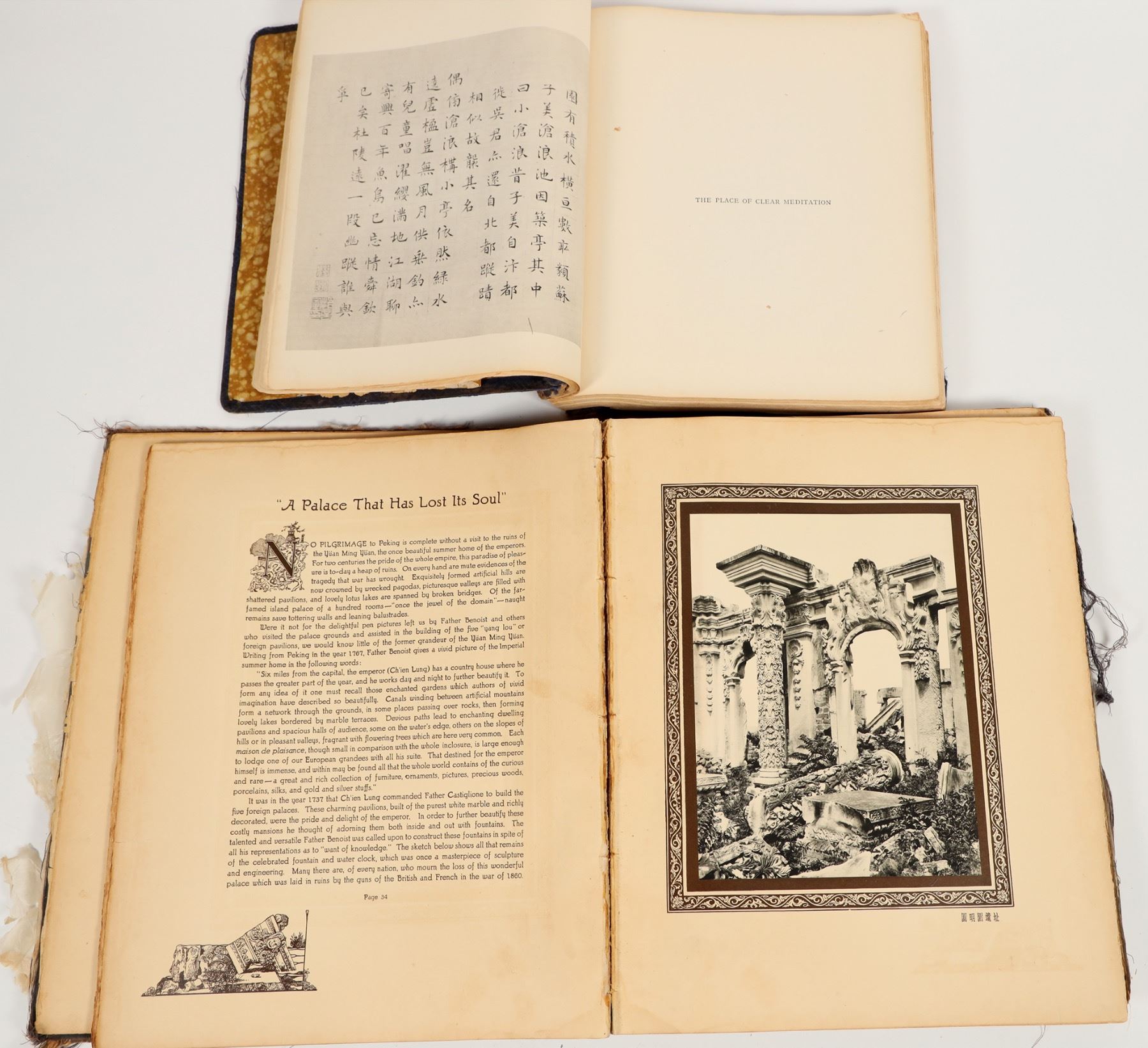 Comprising seventy photographic studies of the celebrated monuments of China's northern capital and its environs complete with descriptive and historical notes by Herbert C. White, Art Director, Signs of the Times Publishing House, Shanghai. Introduction by Hu Shih, Ph. D., formerly Professor of Philosophy at the National University University of Peking. White dedicated the book, "To All Lovers of China's Glorious Artistic Heritage" and expressed sincere thanks to Princess Der Ling for her preparation of the captions of the book which she transcribed from the expertise of the Empress Dowager in the Forbidden City. 1920s China was a period particularly marked by the emergence of photographically illustrated publications dedicated to famous places. As is stated in the book's preface: “The very fact that so many of the ancient landmarks (...) are being torn from their foundations and ruthlessly destroyed, makes an album of this kind not only interesting as an art volume, but a work of immeasurable value to China and to the world, as an authentic record of picturesque Peking." Folio, original embroidered silk pictorial boards. Contains 70 photographic plates mounted, numerous illustrations in text. Rare and desirable publication in poor condition. Professional restoration recommended. In better condition this book sells for over $10,000. See Photos.