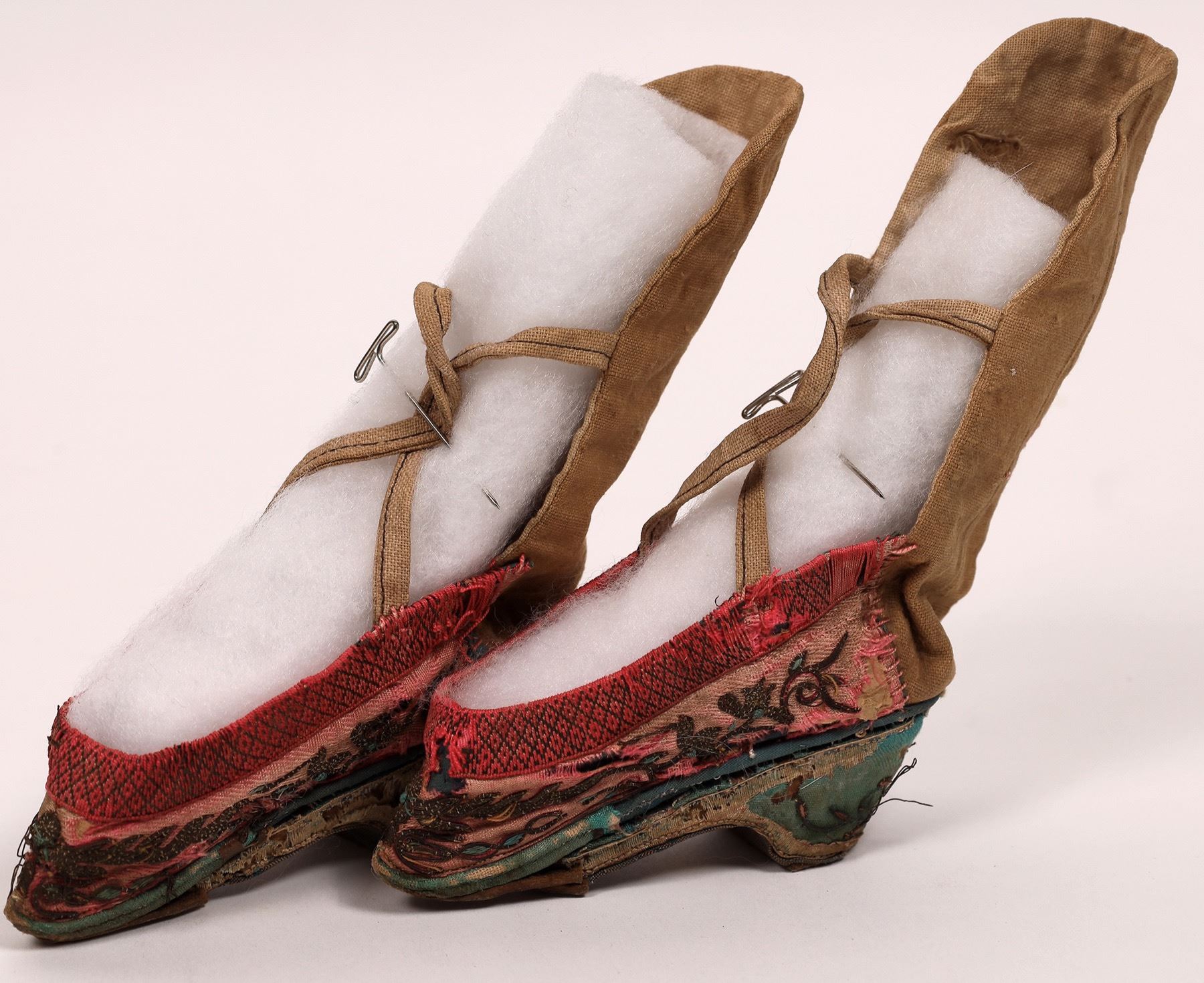 Six inch tall high backed shoes with wooden soles and sewn pattern and red cloth trim. Shoe is only 3 1/2 inches long, so were used on young Chinese with bound feet. City: State: Date: