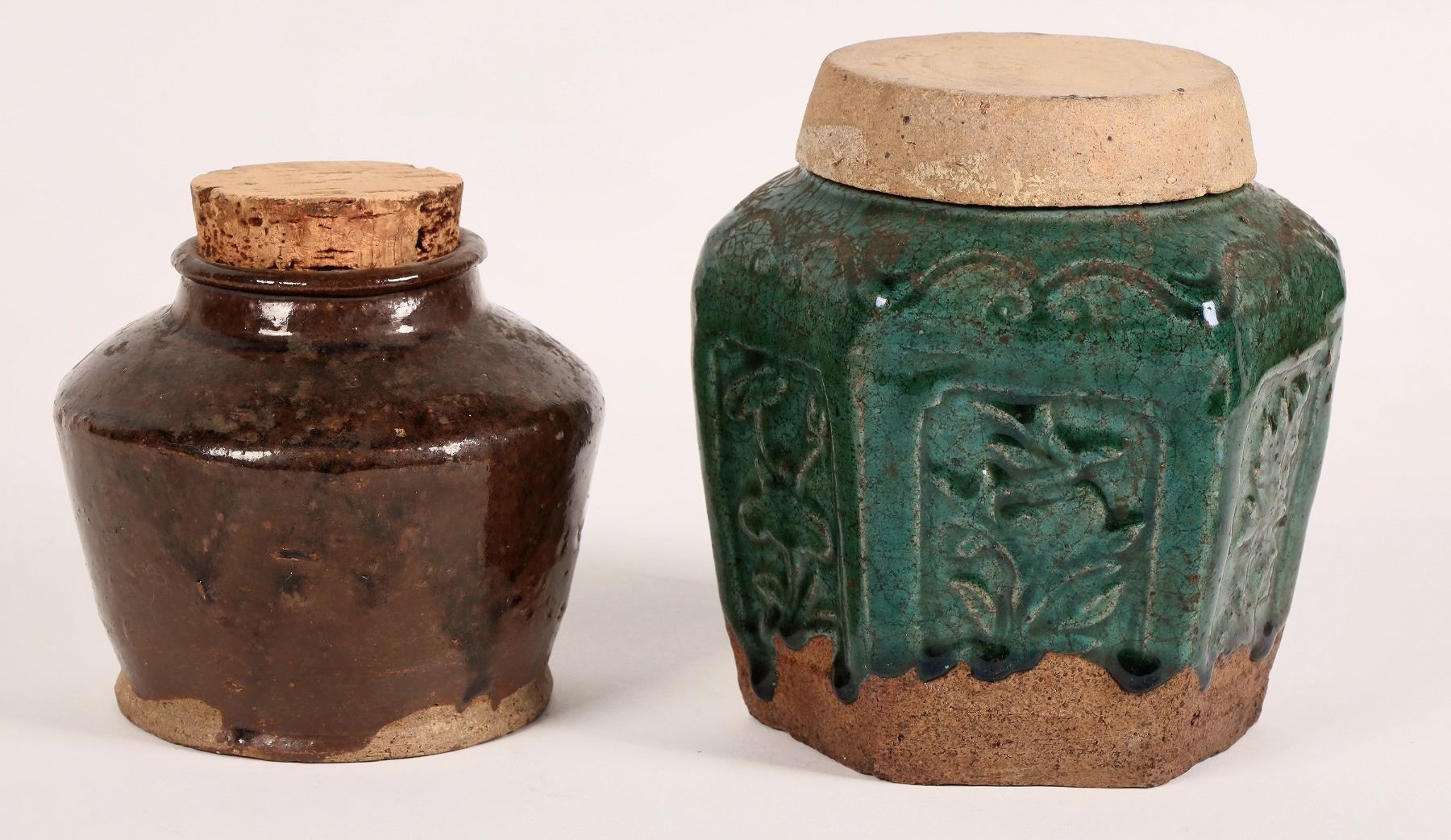 2 Chinese tea containers from Tombstone, AZ c. 1880's. Brown glazed with original cork, 4.5x4.5". Blue-green glazed 6 sided container with original cork, lid