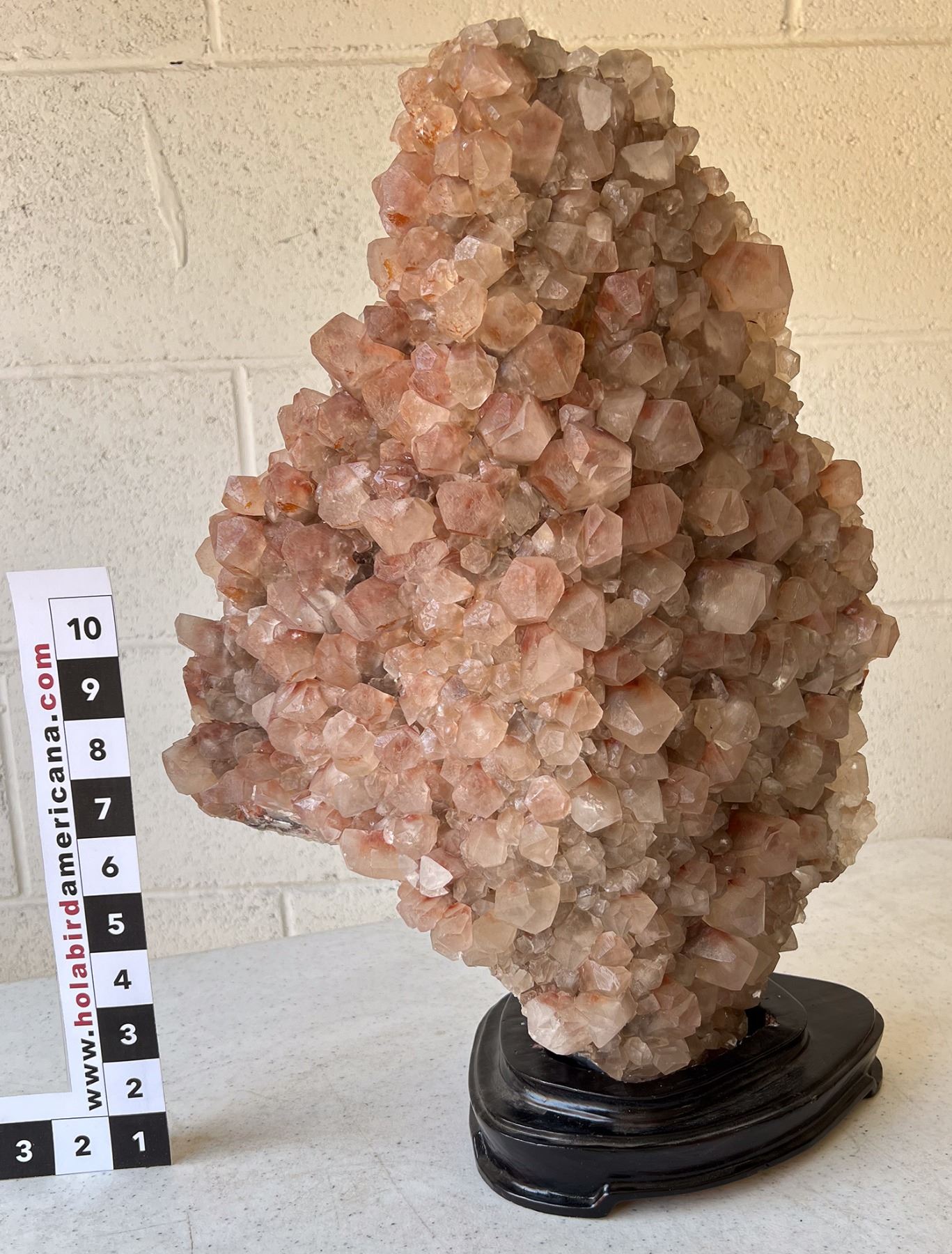 Large pink calcite crystal mass w/wooden base base 8x6x16". China Chunlin Zhu Collection