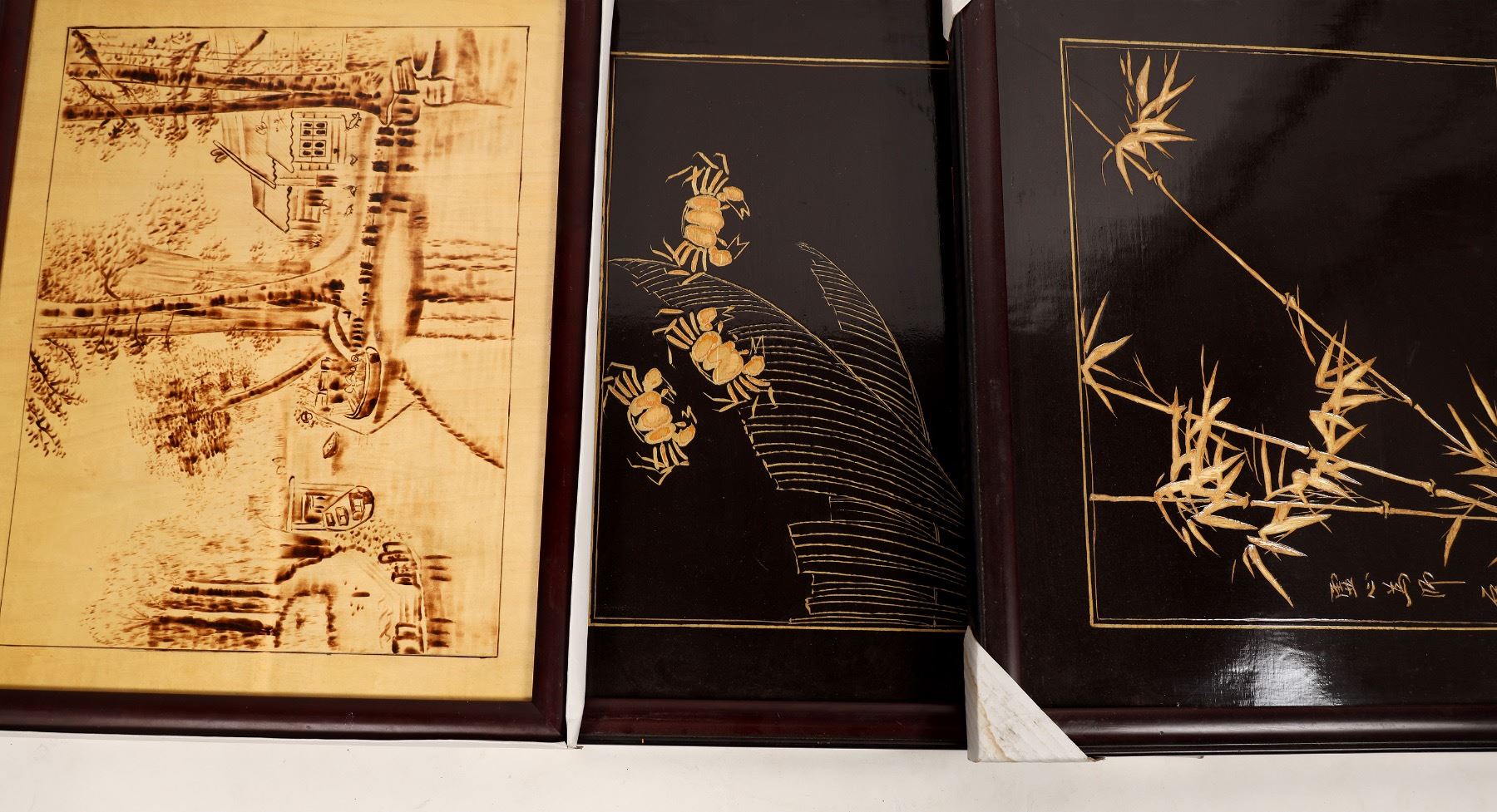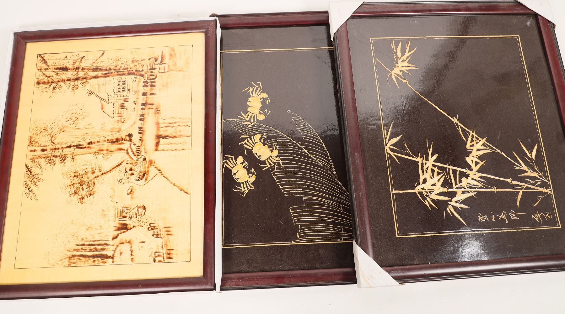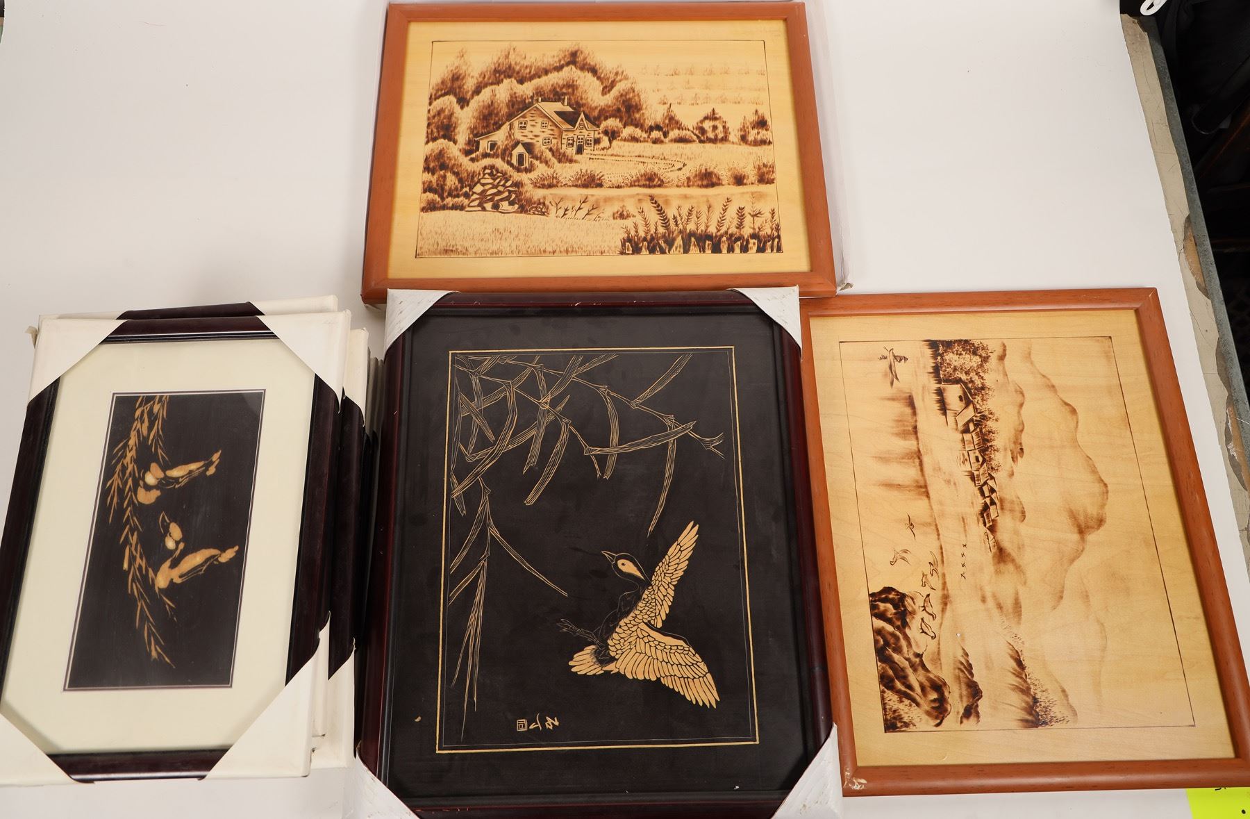 Lot includes 36x framed burnt or carved wall art: 10x 10x15", 2x 25x15" & 4x 20x16" etched bamboo with nature scenes & birds; 7x 18x21" nature scenes & chinese writing, 12x 20x16" burned etchings of woman & natural scenes, very detailed; 1x 12x10" Theropod track replica, from the Entrada Formation in Utah, with tag. Chunlin Collection.[ China Chunlin Zhu Collection
