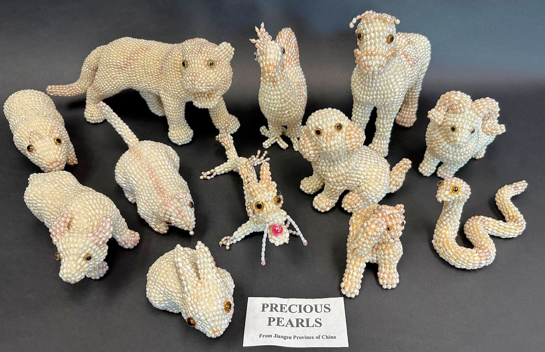 Complete set of Chinese zodiac figures, made from real freshwater pearls. Includes the 12 figures represented by the year you were born, which includes: rat, ox, tiger, rabbit, dragon, snake, horse, sheep, monkey, rooster, dog, and pig. Pearls come from the Jiangsu Province of China. From wiki: The Chinese zodiac is a traditional classification scheme based on the Chinese calendar that assigns an animal and its reputed attributes to each year in a repeating twelve-year cycle. The animals of the Chinese zodiac are not associated with constellations spanned by the ecliptic plane, the Chinese twelve-part cycle corresponds to years rather than months. Chunlin Collection. China Chunlin Zhu Collection