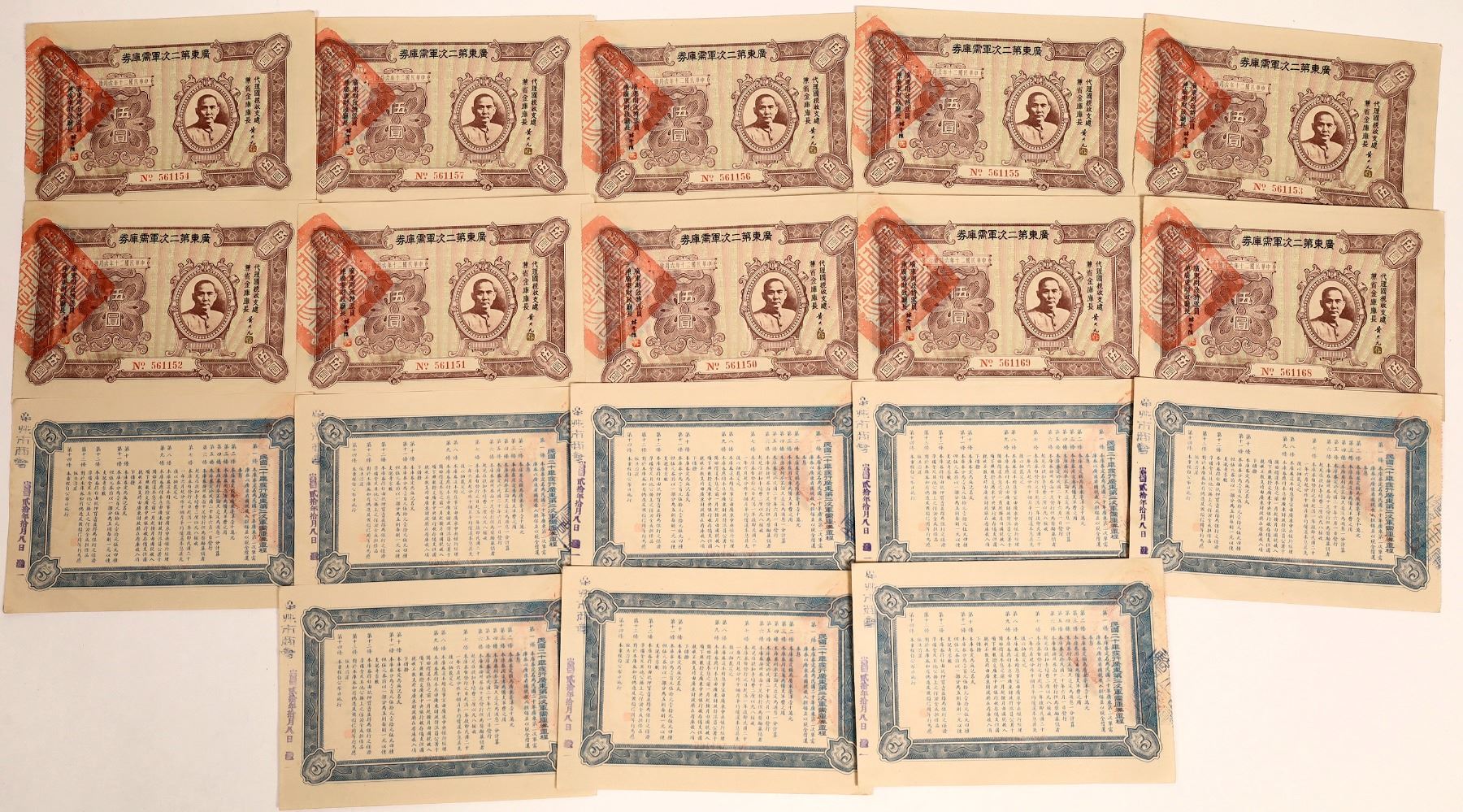 A group of 18 small size Chinese bonds, approximately 4 x 7". On one side is the serial number at bottom center with vignette of Chinese leader at right center at left side is a large red block print. On the reverse is a blue tablet of Chinese writing with the 5 at each corner.