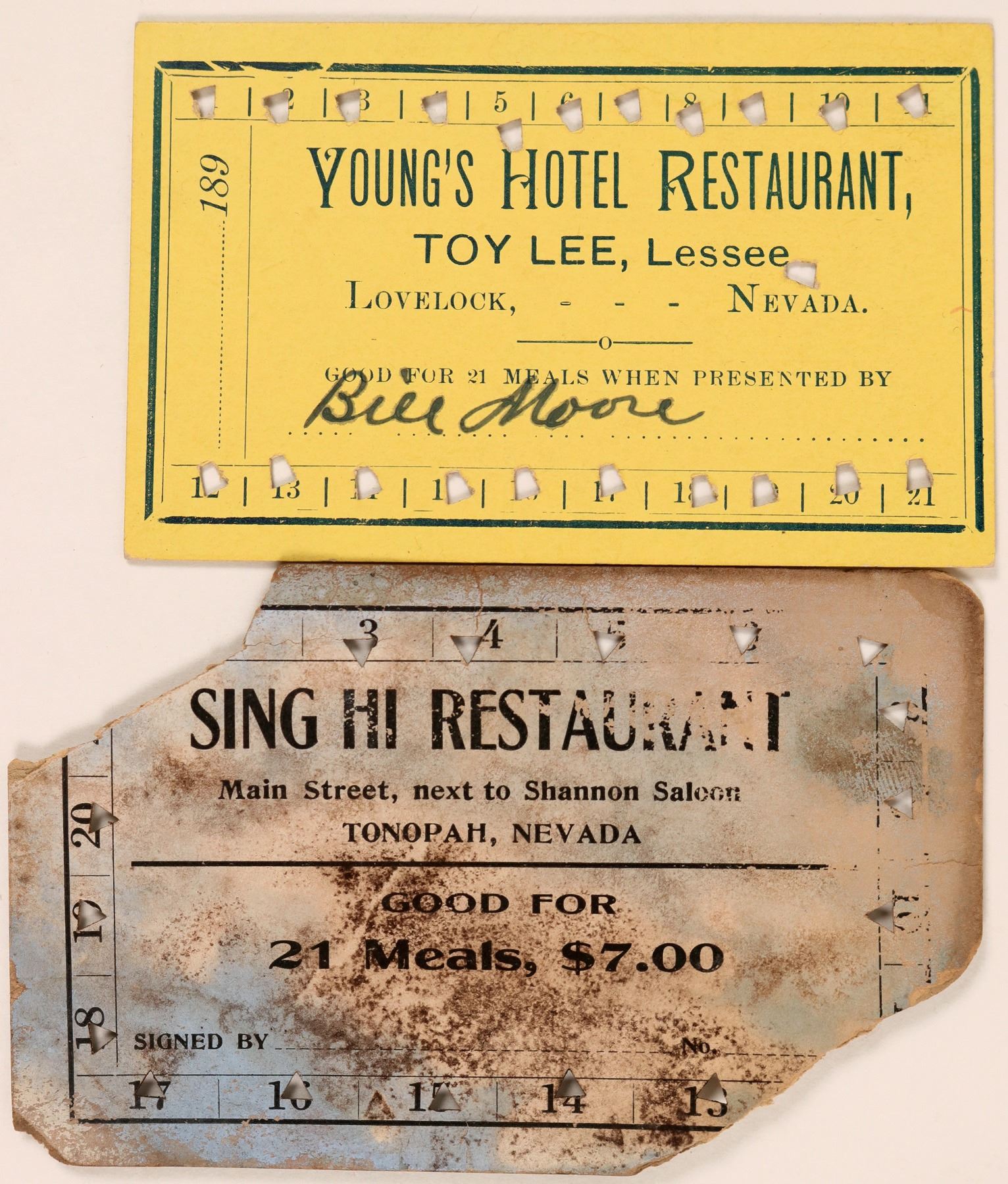 Two meal tickets: Sing Hi Restaurant, Tonopah; Young's Hotel Restaurant, Toy Lee, Lessee, Lovelock. Ex: Ron Lerch Collection.