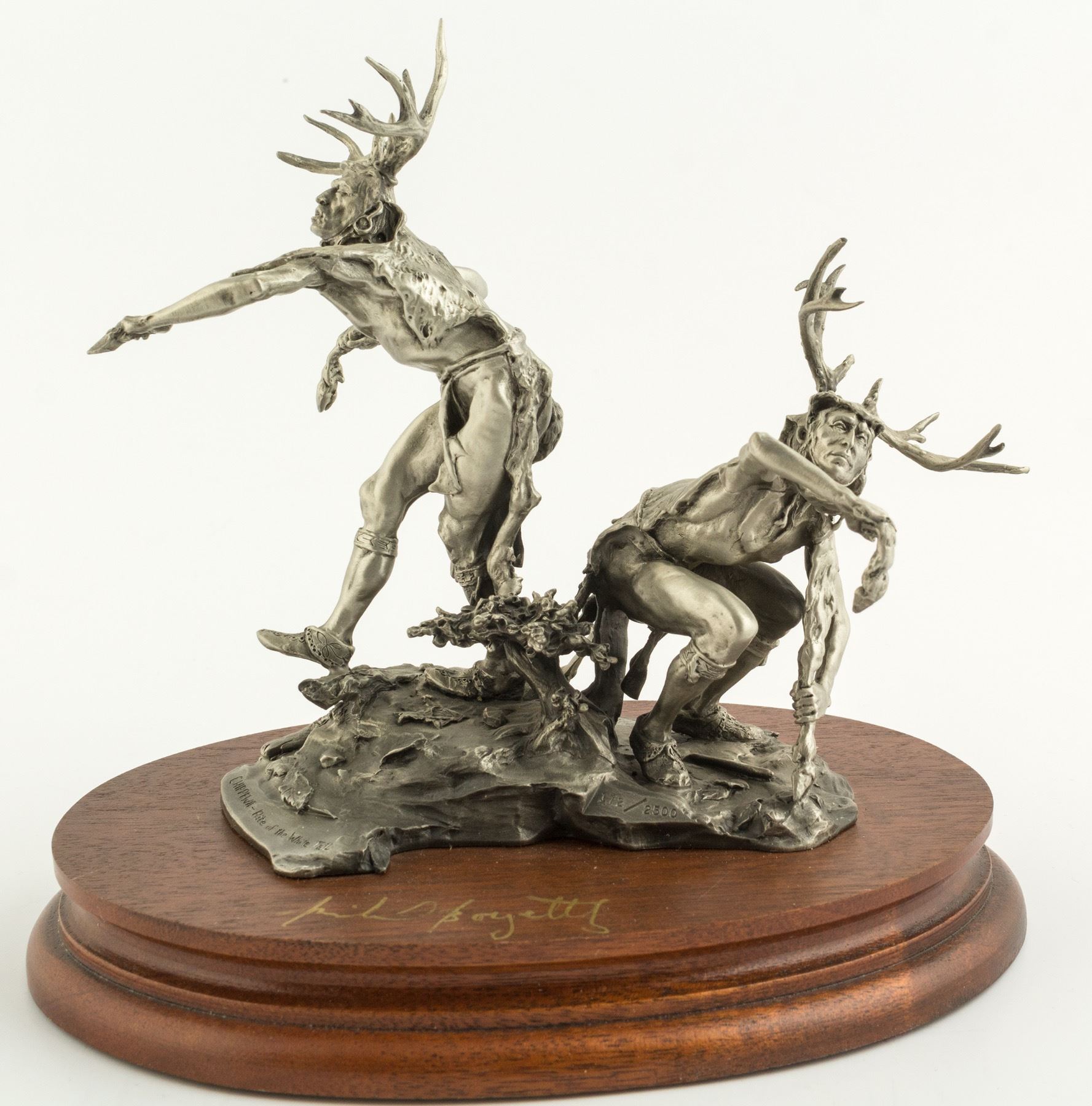 "Chippewa-Rite of the White Tail" by Michael Boyett. Pewter sculpture, # 172 / 2500. 6" x 7" x 4". Dancers in deer garb. State: City: HWAC#: 48154 Date: