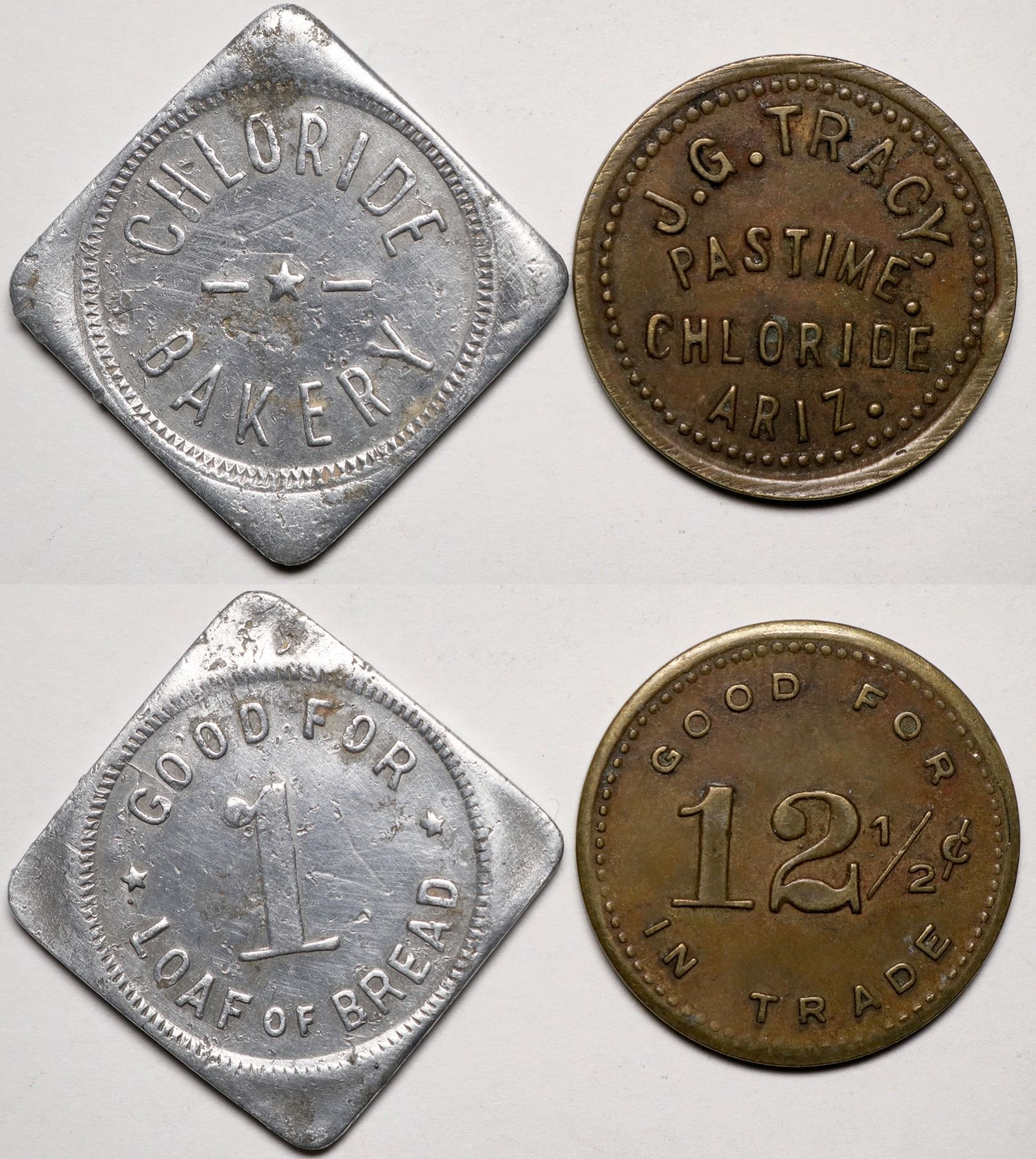 2) J.G. Tracy/Pastime/Chloride / Ariz. // Good For/12.5c/In Trade. Brass, 25mm.