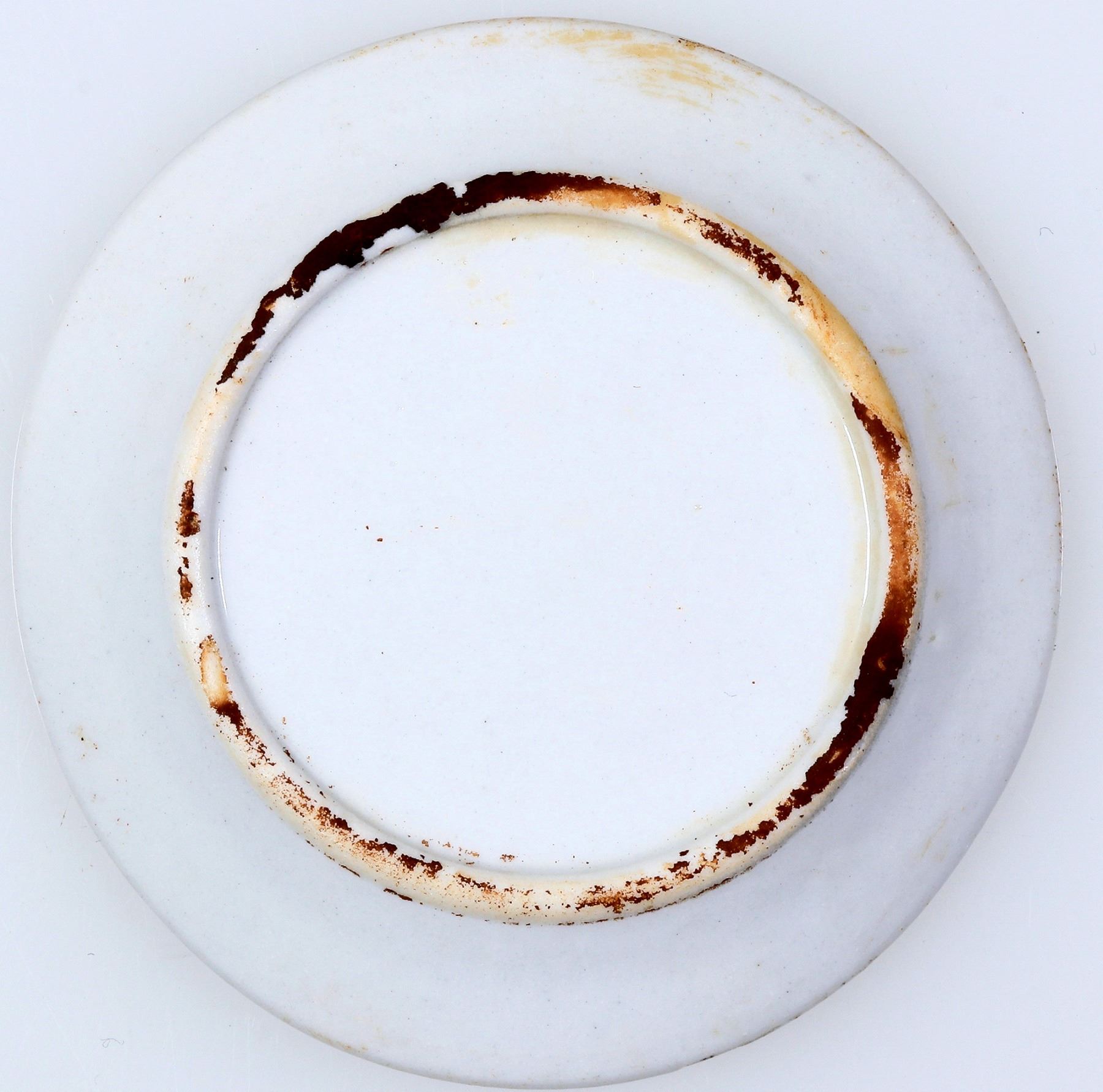 Small white ceramic saucer, possibly for hot chocolate, a specialty drink in the mid 1800's, much like espresso today. 2.75" diameter. Very fine, no damage. Hot chocolate was a Mesoamerican invention from ancient times. It was introduced to the Spanish during their periods of conquest, and in the 1700's-1800's was considered "aristocratic" and cost more than coffee.