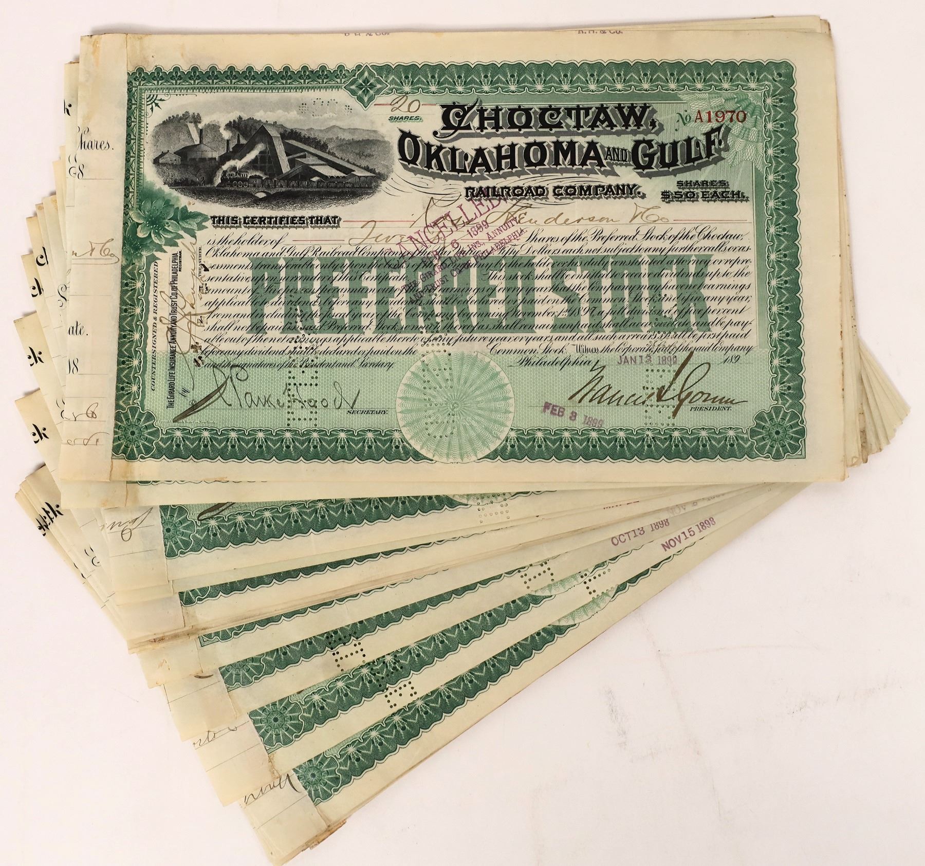 Lot of 25 stocks issued in 1898-99. Green border, black print, and vignette of train passing factory. In 1894, The Choctaw, Oklahoma and Gulf Railroad took over the Choctaw Coal and Railway Company and immediately launched a large scale expansion program. Known informally as the "Choctaw Route". It completed its main line between West Memphis, Arkansas and western Oklahoma by 1900. In 1901 the CO&G chartered a subsidiary company, the Choctaw, Oklahoma and Texas Railroad, to continue construction west into the Texas panhandle, and by 1902 the railroad had extended as far west as Amarillo. By agreement of April 1, 1904, the Choctaw, Oklahoma and Gulf, and practically all of its property, became the property of the Rock Island System.