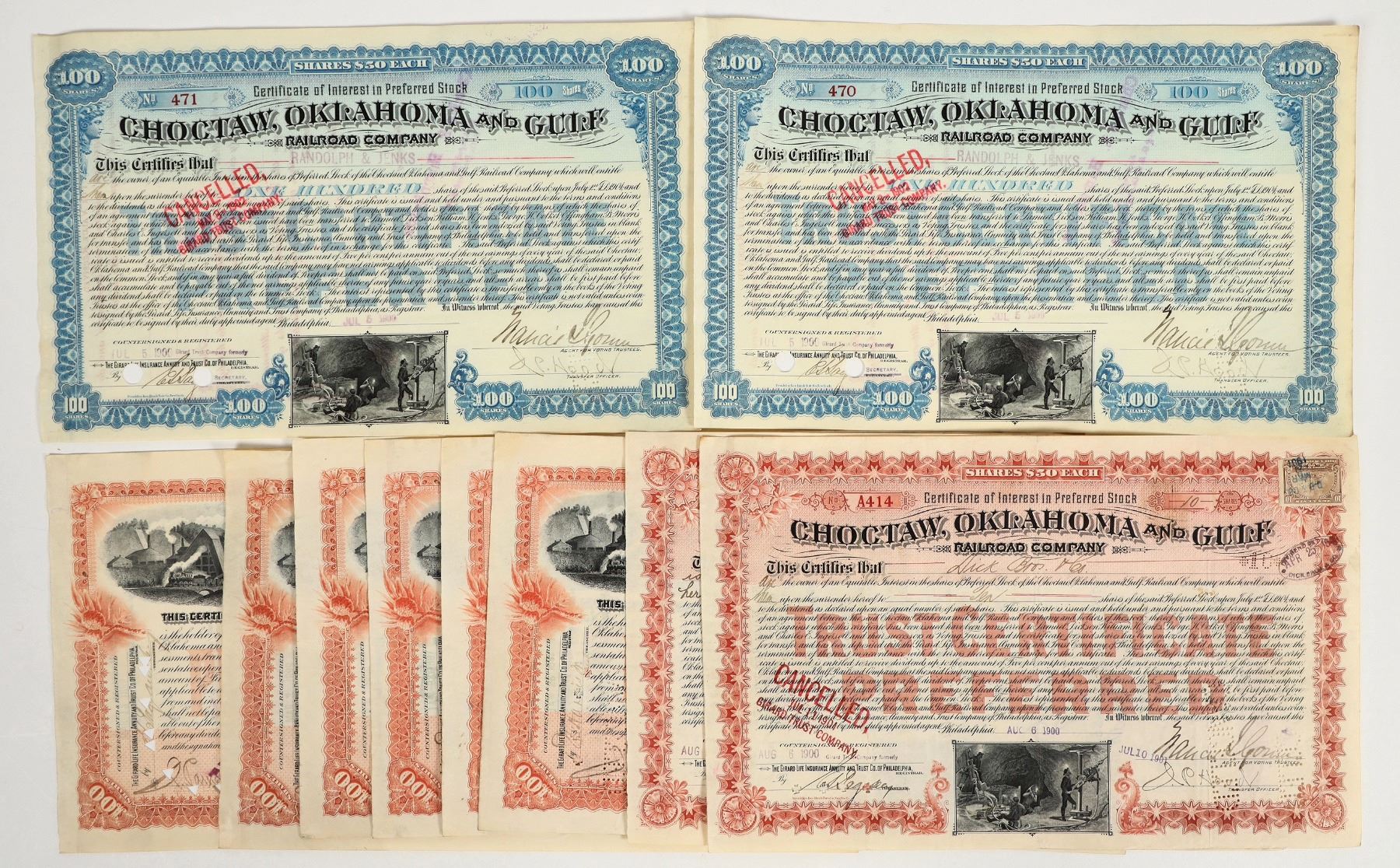 Nine issued stock certificates from the Choctaw, Oklahoma & Gulf Railroad. Two with blue ink from 1900; orange ink from the 1890s. Vignettes of underground mining and a milling operation.