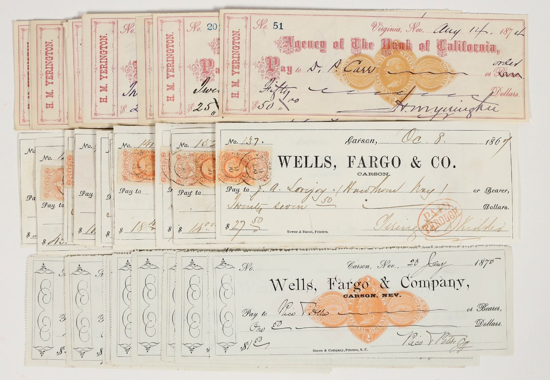 Lot of 30. Ten each of three different types. 1) HM Yerington, Virginia City, Nevada, buff RND, Yerington signed (superintendent of the Virginia & Truckee Railroad). 2) 10 CC Wells Fargo 1860s. 3) 10 RND Carson City, 1870s.
