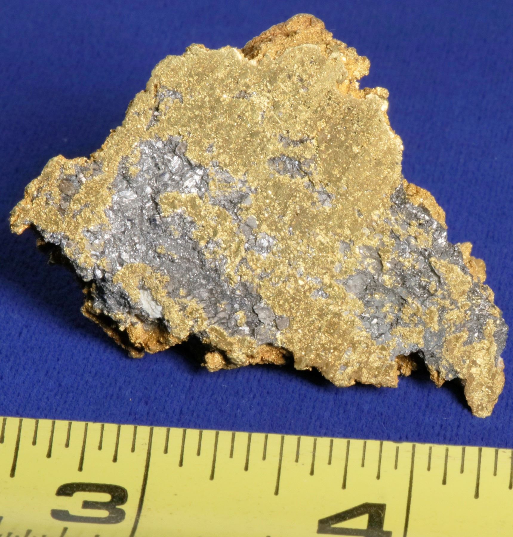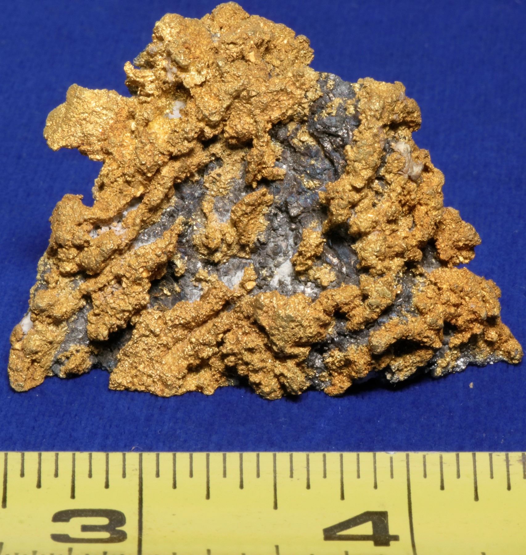2.25 x 1.5 x 1.5" specimen . Most quartz was removed by acid, revealing a very attractive specimen . No location data. The specimen has one cut edge, exposing a very high percentage native gold.