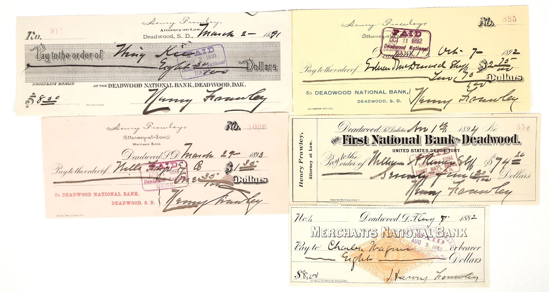 Lot of 5 different. Issued to: Edward McDonald sheriff; Win Kie (Chinese merchant); Wells Fargo Express Co.; William A. Reamer sheriff; and one 1882 rare RN, Merchants National Bank. All from the archive of Deadwood lawyer Henry Frawley.