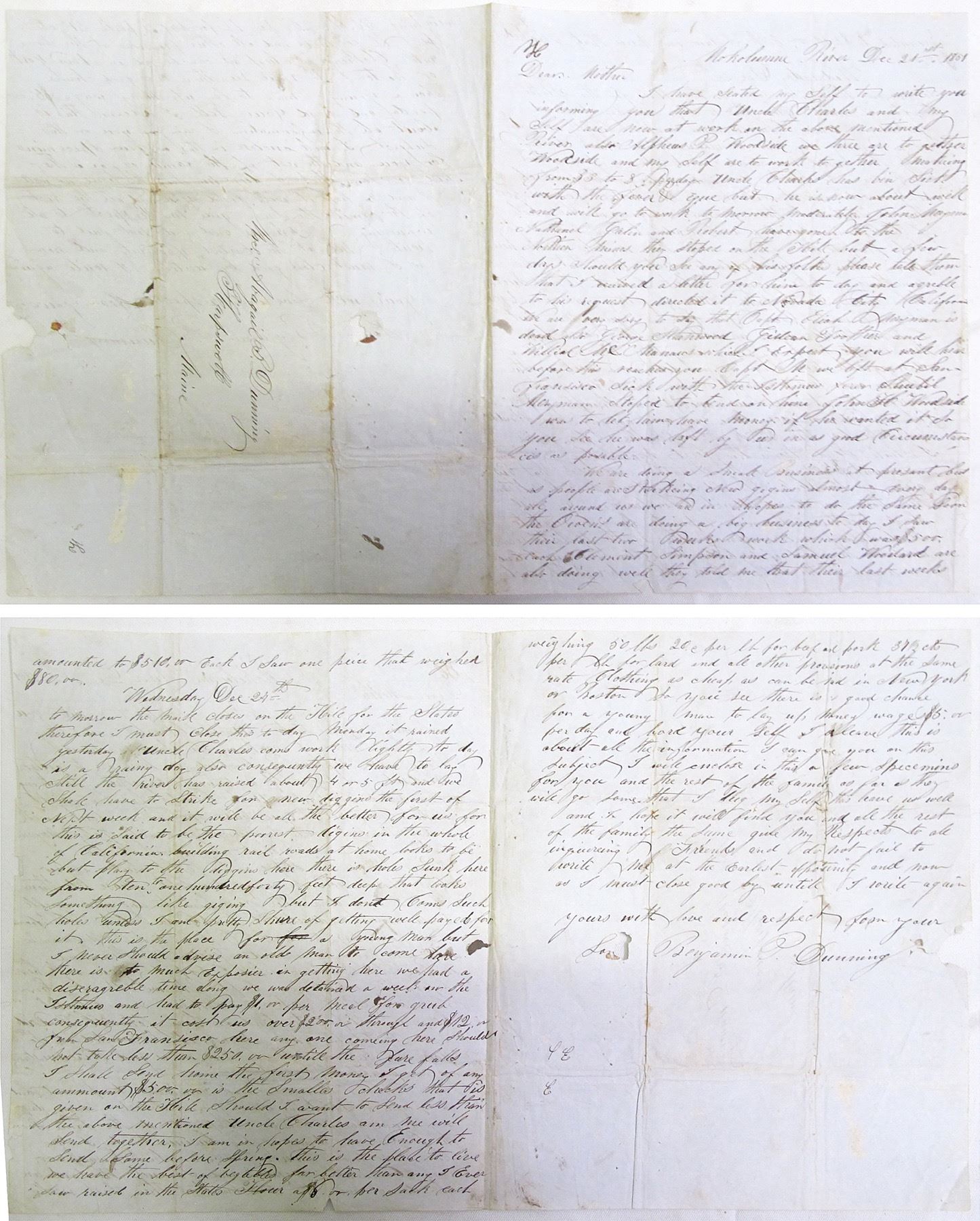 Original three page hand written letter to Abagail Dunning in Harpswell, Maine from her son Benjamin P. Dunning, datelined Mokulumne River, Dec 21st, 1851. Dunning mentions much about the group he traveled with, who all came via the Isthmus of Panama. Many died along the way from "the Isthmus Fever", and he mentions the names. Several of his family members are still sick as he notes. A portion of the group has "gone to the Northern Mines", the Nevada City area, as specifically mentioned. Ben discusses the difficulties of work and life in the mines, telling his mother that building a railroad is nothing compared to what they are doing in California. He complained about the cost of coming across the Isthmus at over $300 extra. Ben is clearly excited about the gold that has been found by his friends and what he expects to find for himself. A very fine letter. State: California City: Mokolumne River Date: HWAC# 84836