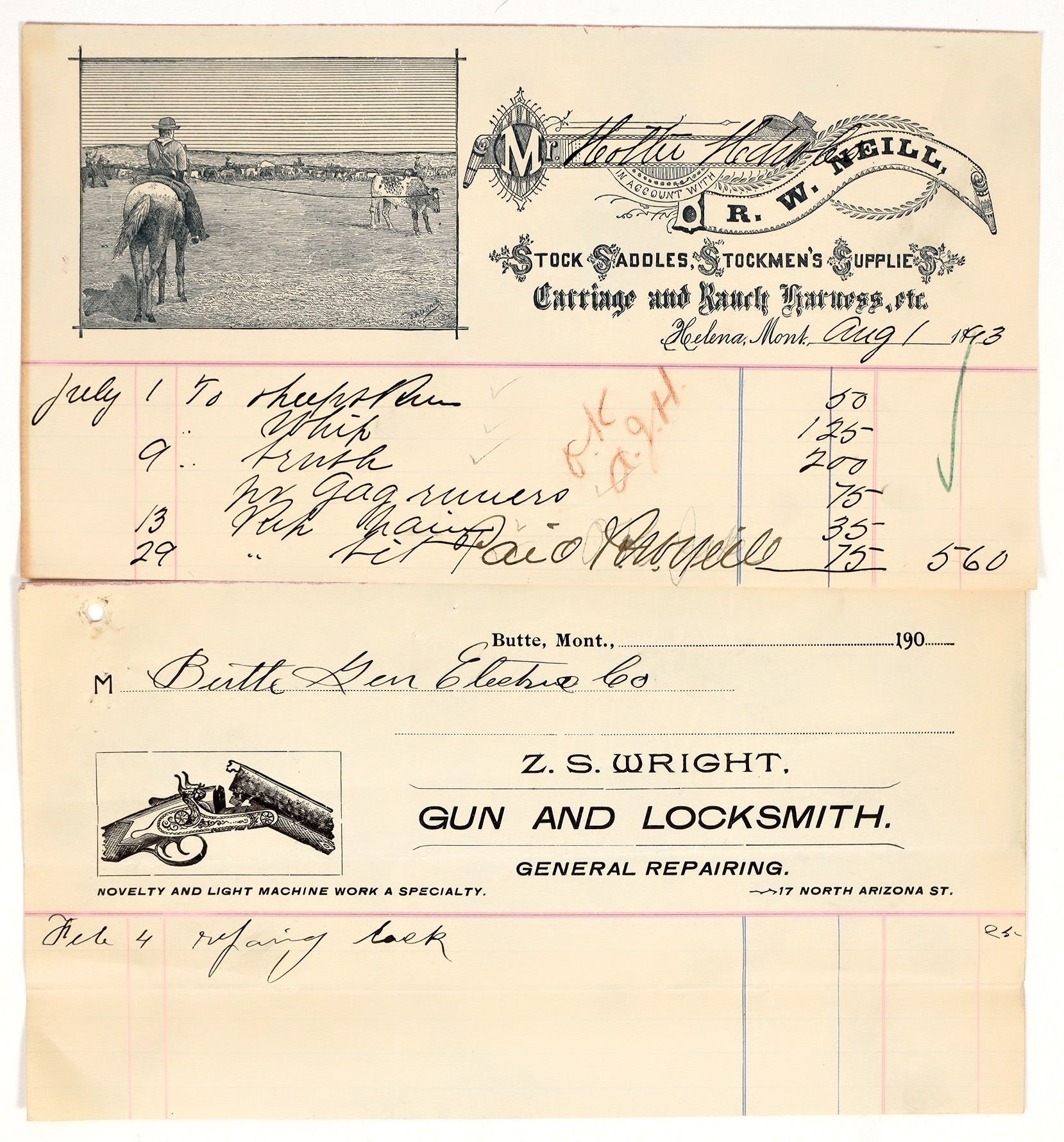 Lot of 2 different. 1) R.W. Neill, Stock Saddles, Ranch Harness, Etc., Helena, 1893. Excellent vignette of cowboy roping cattle! 2) Z.S. Wright, Gun & Locksmith, Butte, 190-. Issued to the electric company. Vignette of a rifle.
