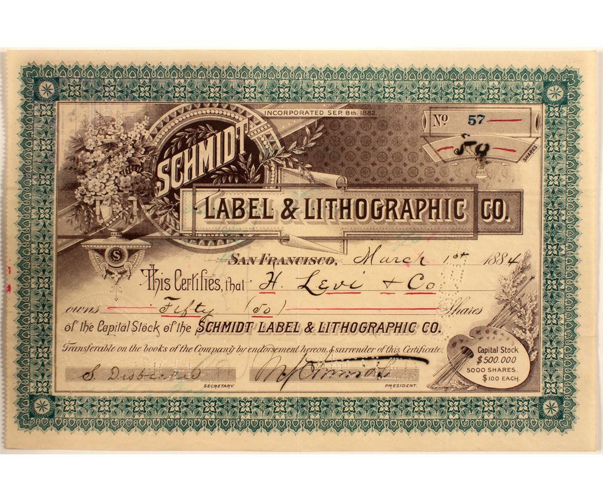 You've seen their name on a huge variety of Western lithographs. Here is a stock, gorgeous as one would expect. No. 57. Issued for 50 shares to H. Levi & Co. on March 1st, 1884 in SF. Signed by Schmidt (president) and Disbecker (secretary). Punch cancellations through signatures. 9.5" x 6.5" Prag Collection