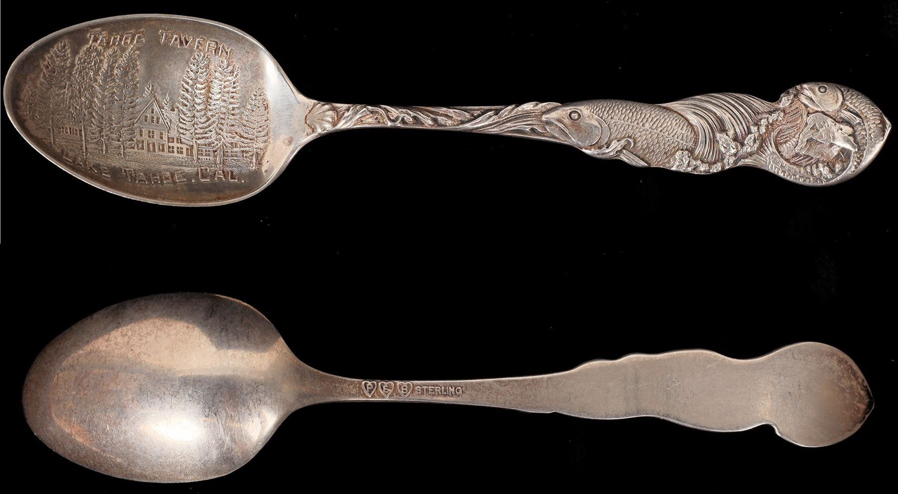 Choice Tahoe Tavern souvenir sterling silver spoon with engraved bowl, "Tahoe Tavern" and "Lake Tahoe, Cal." Vignette of the Tavern building in the woods. Fish handle. Reverse marked sterling. 5.25" Believed to have been made based on Harold Parker photograph and sold in the Tahoe Tavern gift shop c.1906-10. The Tahoe Tavern first opened in the spring of 1902. It was built by DL Bliss who had made his fortune in supplying lumber to the Comstock mines. Bliss transitioned from lumber to creating the tourism industry in Tahoe. He built the Tavern, a railroad from Truckee to the pier at Tahoe City, and employed a line of passenger steamboats. This spoon dates to the early promotional period for Tahoe!