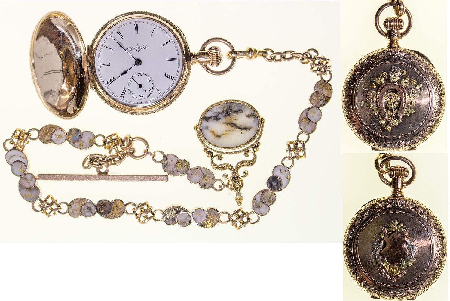 Pocket watch with a chain containing 7 sets of small gold/quartz samples and one large (27mm x 32mm) gold quartz sample. Watch has fancy engraving and the script is also fancy. This must have been an expensive watch on its own. Illinois watch. By 1890 the Illinois watch company had established corporate offices in San Francisco. Presented to John J. Kelley (Kelling) on June 7, 1899. Date: 1899 Location: California HWAC# 22753