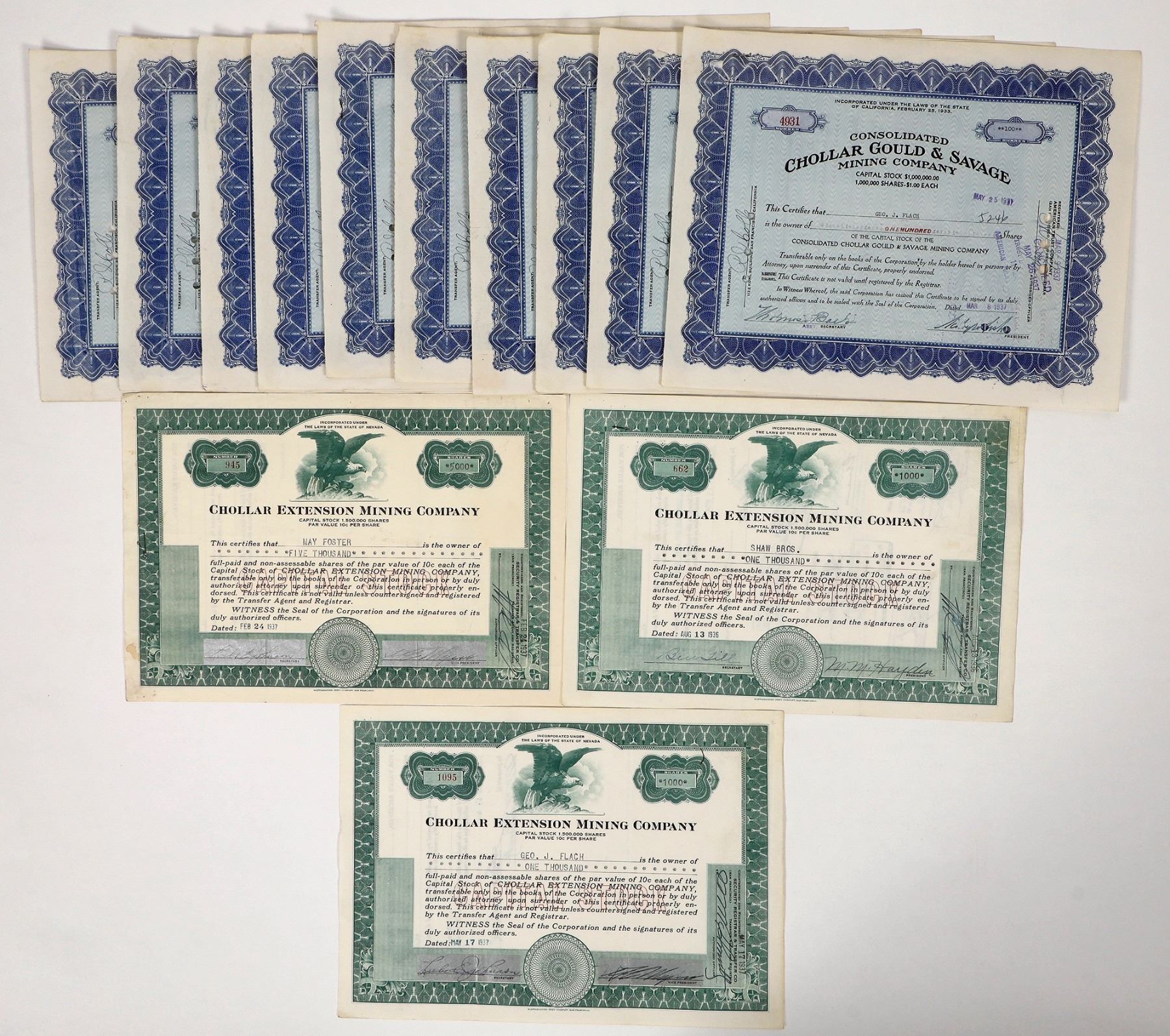Issued-3x 1936-37 Collar Ext. Mining and 10x 1937 Cons. Chollar Gould & Savage.