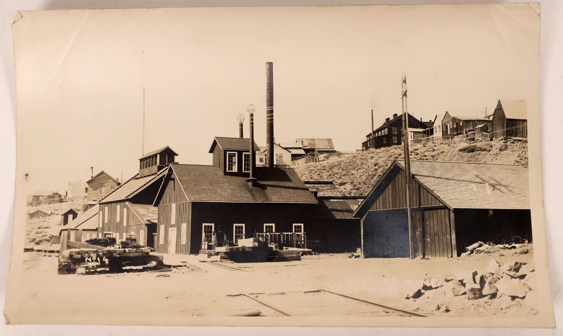 No. 14. Chollar Mine, VA City, Nev. 5 x 8" Undated and photographer not listed; probably c.1900-10. Good contrast and focus. The Chollar Mine is located between the Hale & Norcross and Potosi mines in Virginia City. In the 1860s, it was involved in litigation with the Potosi which ended with them merging, but they eventually split again. Tours are still offered today.