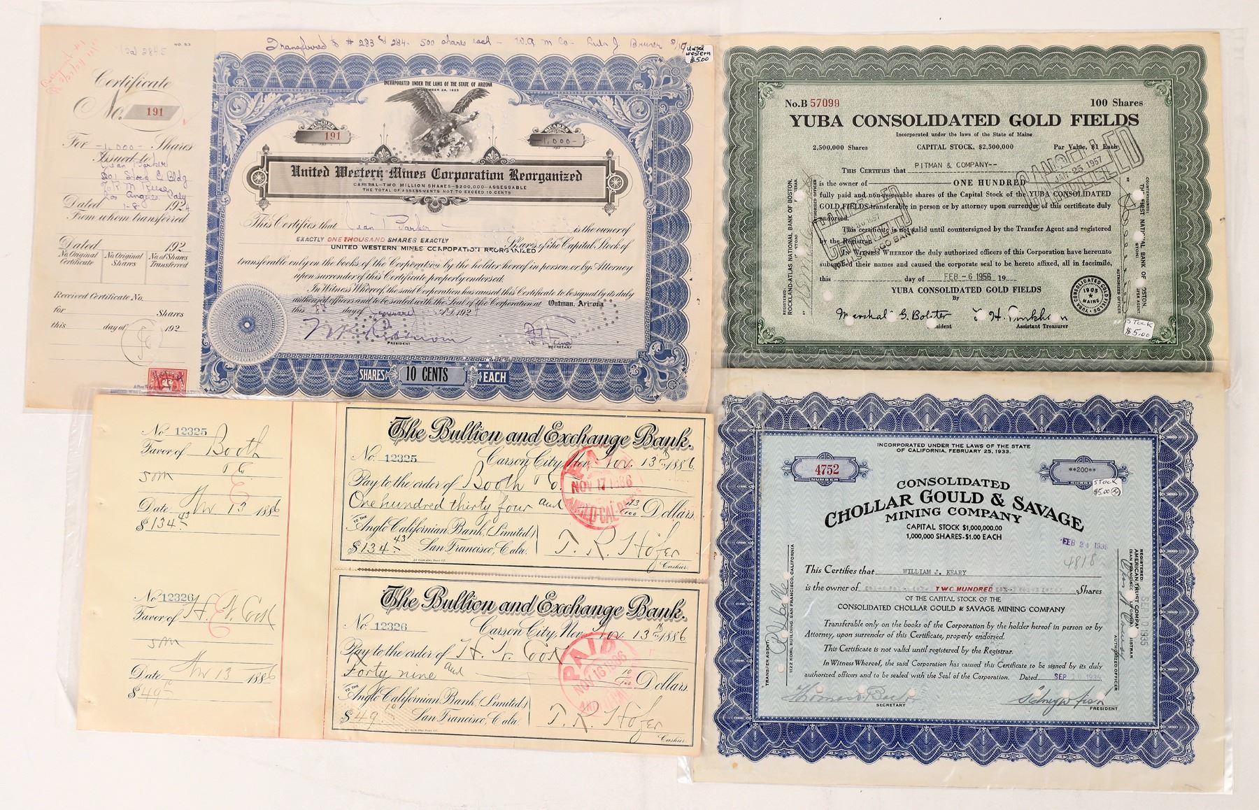 Chollar, Gould & Savage Stock Certificate, as well as Yuba Consolidated and United Western Mines Corporation Reorganized, All are cancelled. There are also two (2) checks written on The Bullion and Exchange Bank and dated November 13, 1886. All are in decent condition. Please see photos for more detail. California 1800s-1900s Nevada