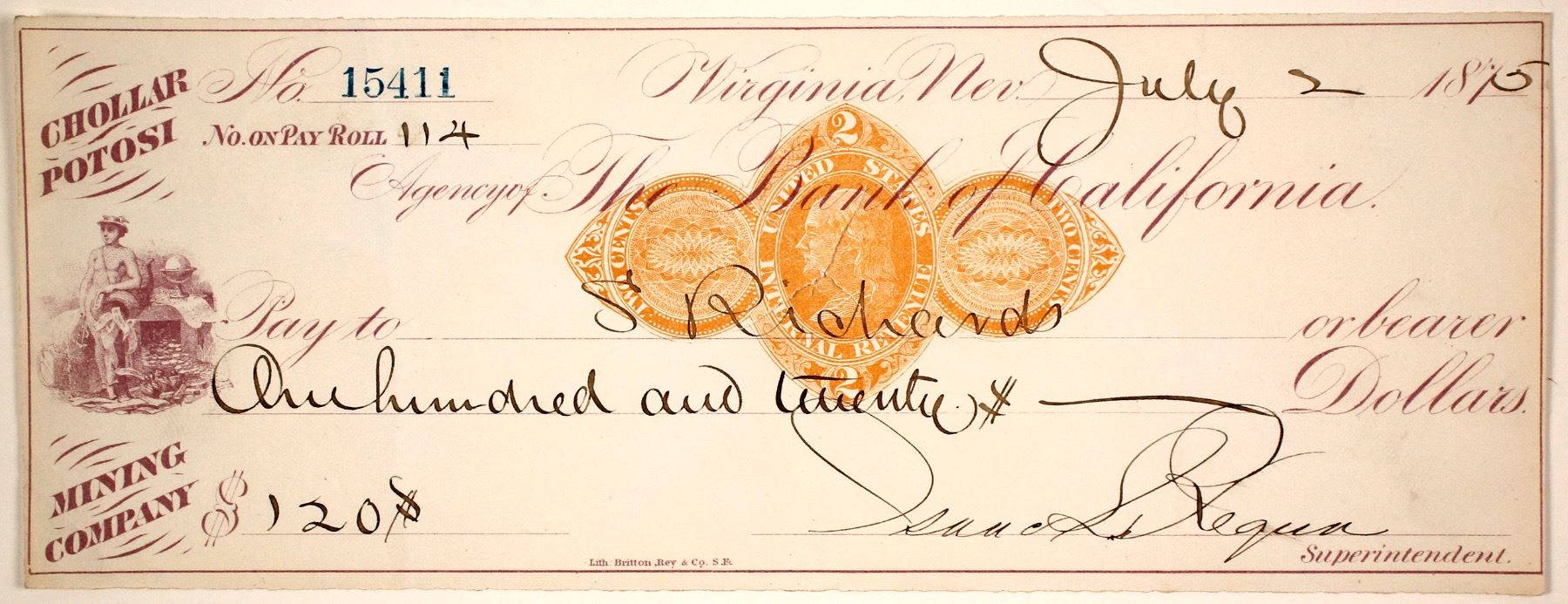 Very scarce, especially in this clean of condition. Agency of the Bank of California - Datelined Virginia, NV July 2, 1875. RN-D1 printed revenue stamp. Signed by Isaac Requa, Superintendent who had come to California in 1850. By the summer of 1856, Isaac flumed the American middle fork at Big Bar with great success. In the early part of 1861, he traveled to Virginia City, Nevada, where over the next eighteen years, he was the superintendent of the Chollar-Potosi mines. During that time, two years of which he was also the superintendent of the Gould & Curry mine plus ten years the manager of the Union Mill and Mining Company. The later was the collection of mills owned by William Sharon and the bank of California also known as the “Bank Ring”. Cut cancel and folds. The Chollar & Potosi were located in southeast Virginia City adjacent to the Hale & Norcross. The two fought in court when the Chollar claimed the Potosi had staked land on their claim. The lawsuit ended in a merging of the two companies in 1865. They later split apart again in the late 1870s. Date: Location: Virginia City, Nevada HWAC# 57621