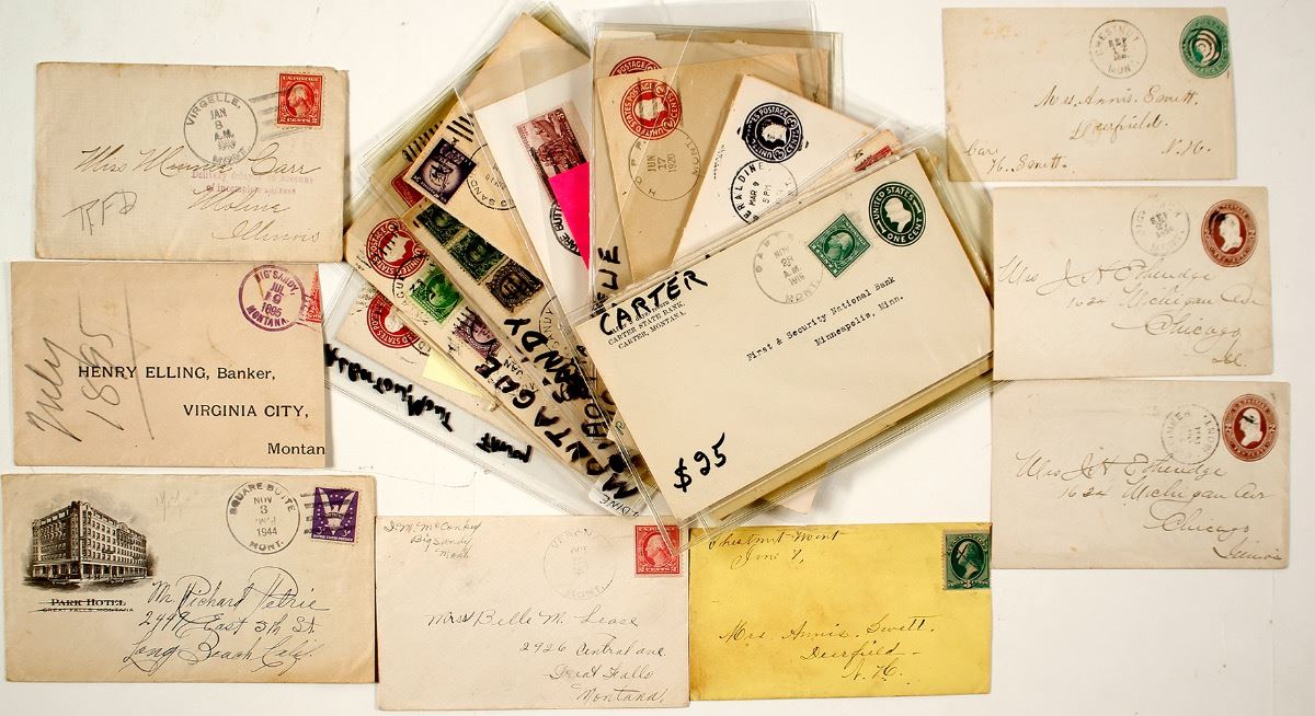 Twenty-four total. Four territorial. Two Chestnut territorials including one manuscript. Two Big Timber territorials. Also a fabulous 1895 Big Sandy (1887-now) purple strike, 1919 Virgelle (1902-1961) delivery delayed, Square Butte Park Hotel pictorial, 1917 Verona (1914-1935). Highwood, 1920 Hopp, Montague, 1918 Norbert, Geraldine, 1916 Carter with Carter State Bank 'cc, Warrick, 1931 Waltham. City: State: Montana Date: ID: 37040
