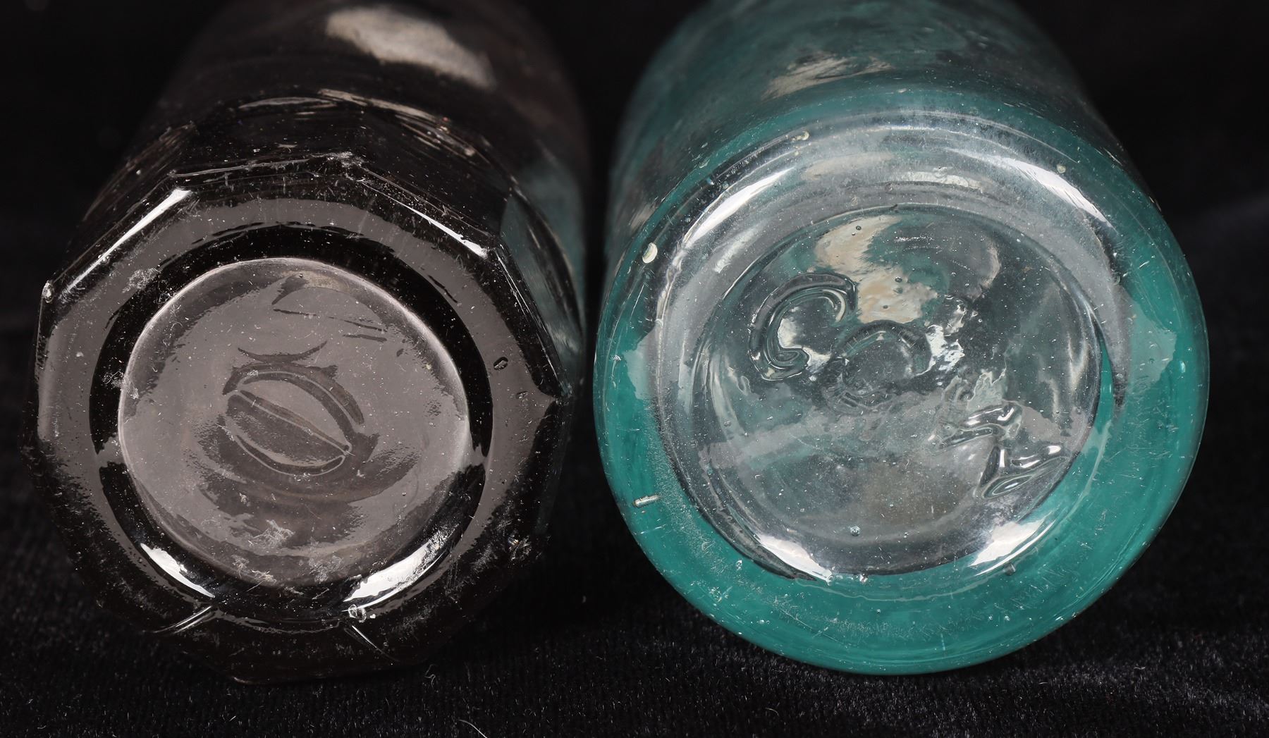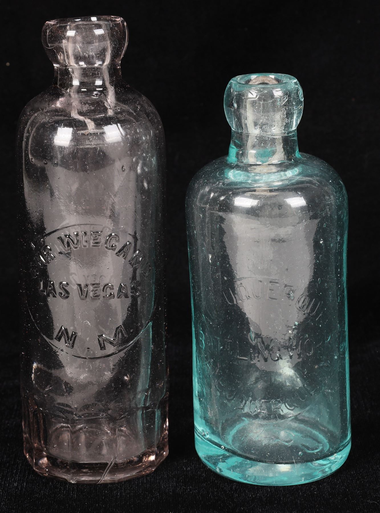 Both bottles embossed, with an oval slug plate on the front of the bottle. Chr. Weigand ( au ) / Las Vegas / N.M. ( ad ).// Base: Embossed with an oval, with a line through it. Very light, sun colored amethyst, Hutchinson style soda, with 10 sided mug base. Beautiful, clean and shiny. Small 1/8" base flake, and a smaller 1/6" base rub mark. Otherwise, like new...Very rare, in this unusual light sun colored amethystine colorization . Albuquerque ( au ) / Bottling Works / Albuquerque , NM. ( Note: the "N", in NM, is embossed backwards!) . Aqua, Hutchinson style soda. 6 1/4" tall, applied top, clean and shiny. Base: Embossed C.G.W.( Embossed upside down ! ) . The body of the bottle is also nicely whittled. Great pair of rare sodas. Las Vegas /Albuquerque New Mexico