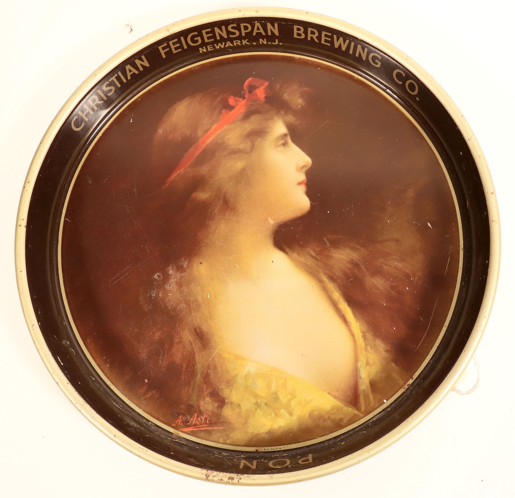 This beer tray measures just over 13 in. with "Christian Feigenspan Brewing Co./Newark, N. J. " on the rim, with the "P.O.N." the (pride of newark) opposite. The base has a beautiful woman with the familiar red ribbon in her hair, a reproduction of Italian artist Angelo Asti. Condition is very good. Minor scuffs. Newark New Jersey
