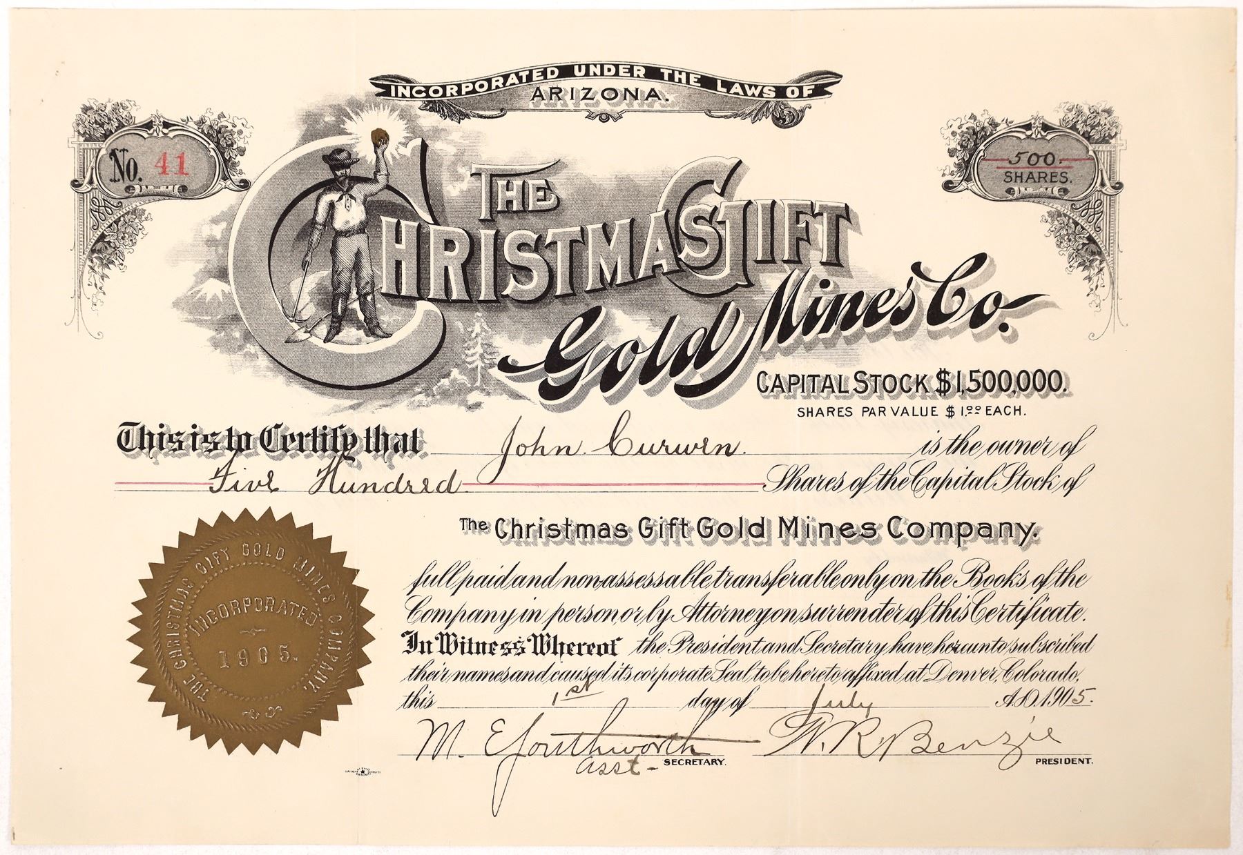 Very nice certificate #41 issued for 500 shares in 1905. The company incorporated in Arizona. The Christmas Gift Gold Mines Company owned and operated the Christmas Gift group of claims in the Casa Grande mining district in Pinal County, Arizona. The Mining Investor in 1908 noted that the shaft on the mine was down to 270 feet, on the way to their 600 foot target. The company had ordered much equipment including air compressors, pumps, drills, and an 80 h.p. boiler. The certificate has a fantastic vignette of a miner at the top holding up a gold colored nugget, a.k.a. the "Christmas Gift". Very unique and rare. VF. Uncanceled.