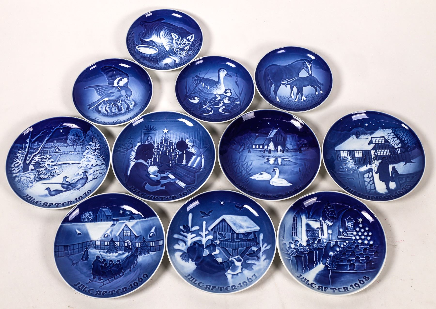A collection of eleven, blue and white Christmas-themed plates from Bing & Grondahl (Denmark). All undamaged and in original packaging. Sizes vary between 7 and 8 inches in diameter. See photo for design details.