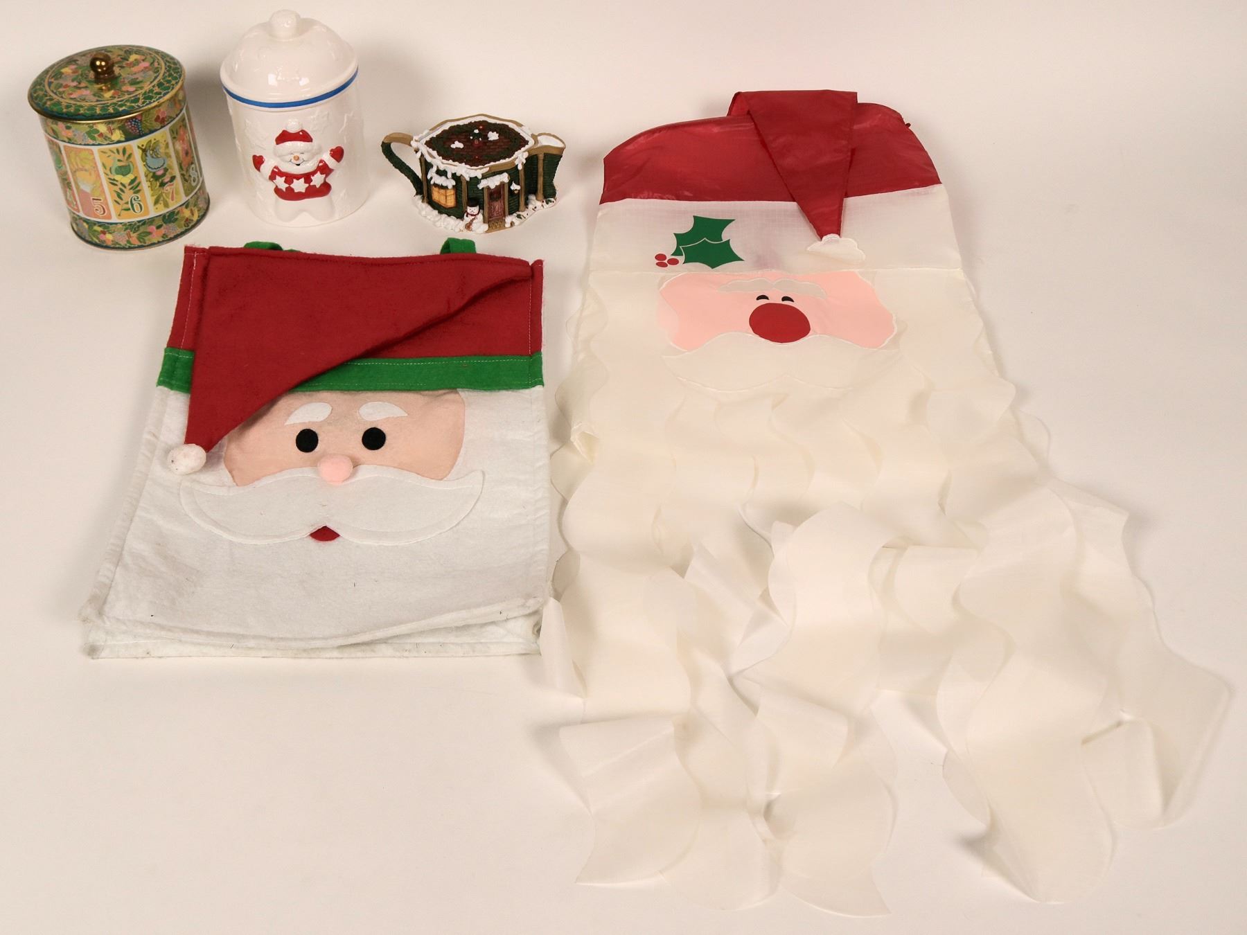 In this lot of Christmas decorations is a Santa windsock; a Santa felt gift bag; a Santa candy jar; a 12 Days of Christmas cookie tin; and a designer teapot Christmas themed NIB.