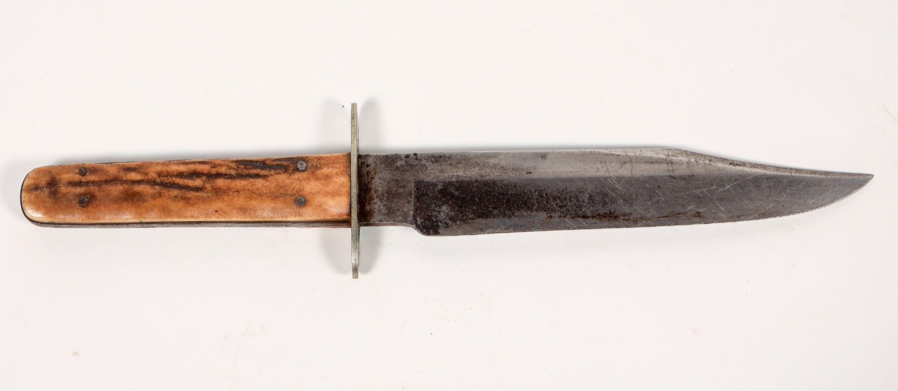 This Bowie knife was made by "Christopher Johnson & Co,/ Western Works Sheffield" marked on the blade with no country listed. The knife is 9.75 in. overall length, 3.75 in. stag handle, 5.875 in. clip point blade. The ricasso is also marked "Johnson/ Western/ ==Works/ Sheffield" There is a brass guard, four pins anchor the stag grips. In very good condition. The sheath is leather with the collar and belt loop missing. Please see photos for details. C. 1880's.