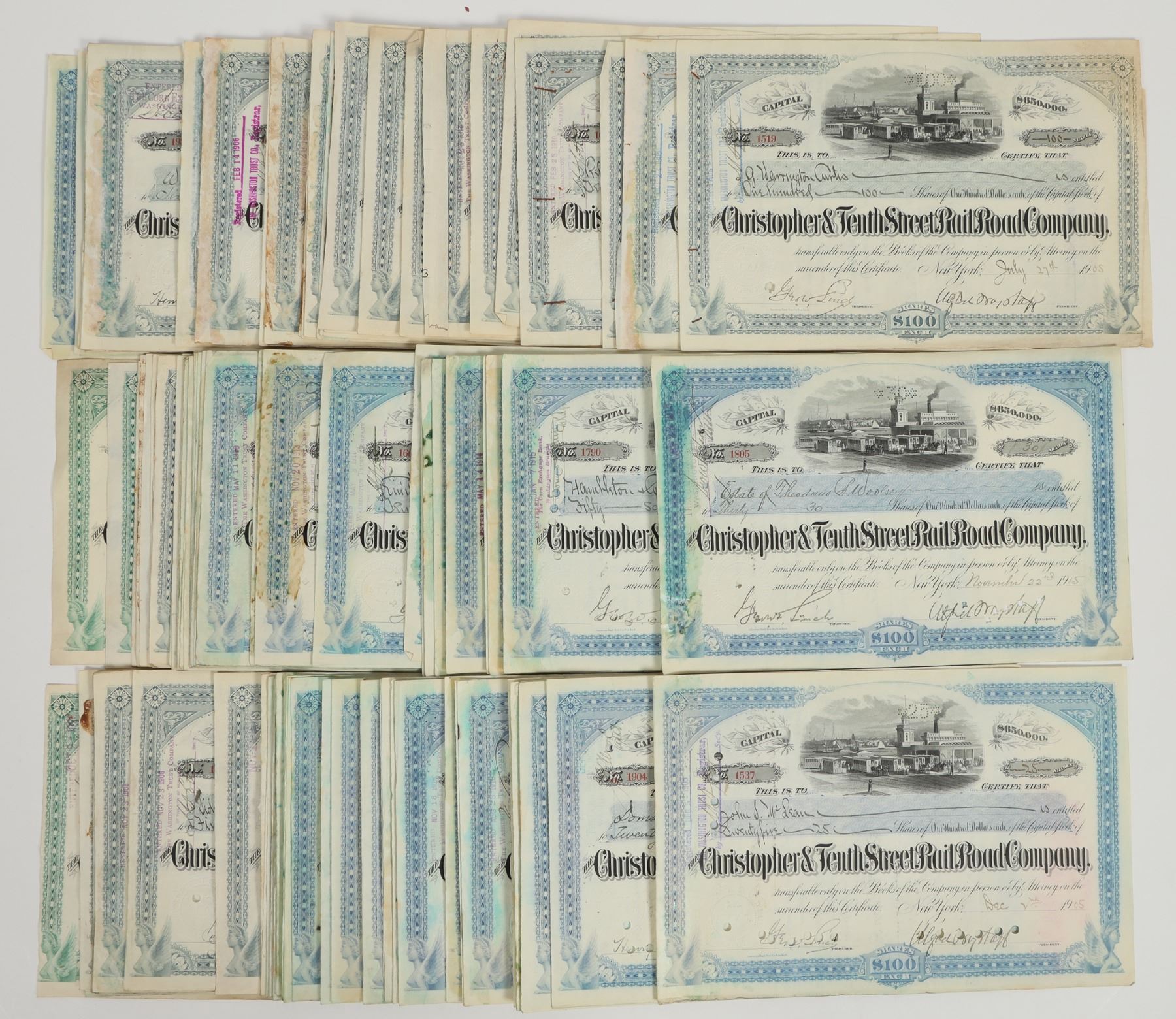 About 193 Christopher and Tenth Street Railroad Company stocks issued between 1900 and 1925, cancelled and some endorsed/revenue stamped on reverse. The company chartered in 1873 and traveled between the Christopher Street Ferry on the Hudson River and the East Tenth Street Ferry on the East River.