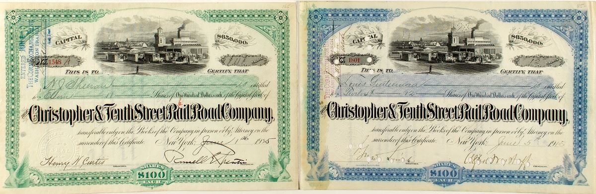 Two different very attractive certificates, both with the same vignette of waterfront depot, but with different color borders. One was issued 1915 (punch cancelled), the other 1925 (not cancelled). Printed by ABN. (Prag Collection) City: State: New York Date: 1915 & 1925 hwac# 33956