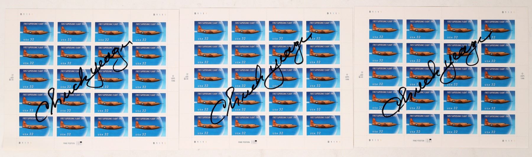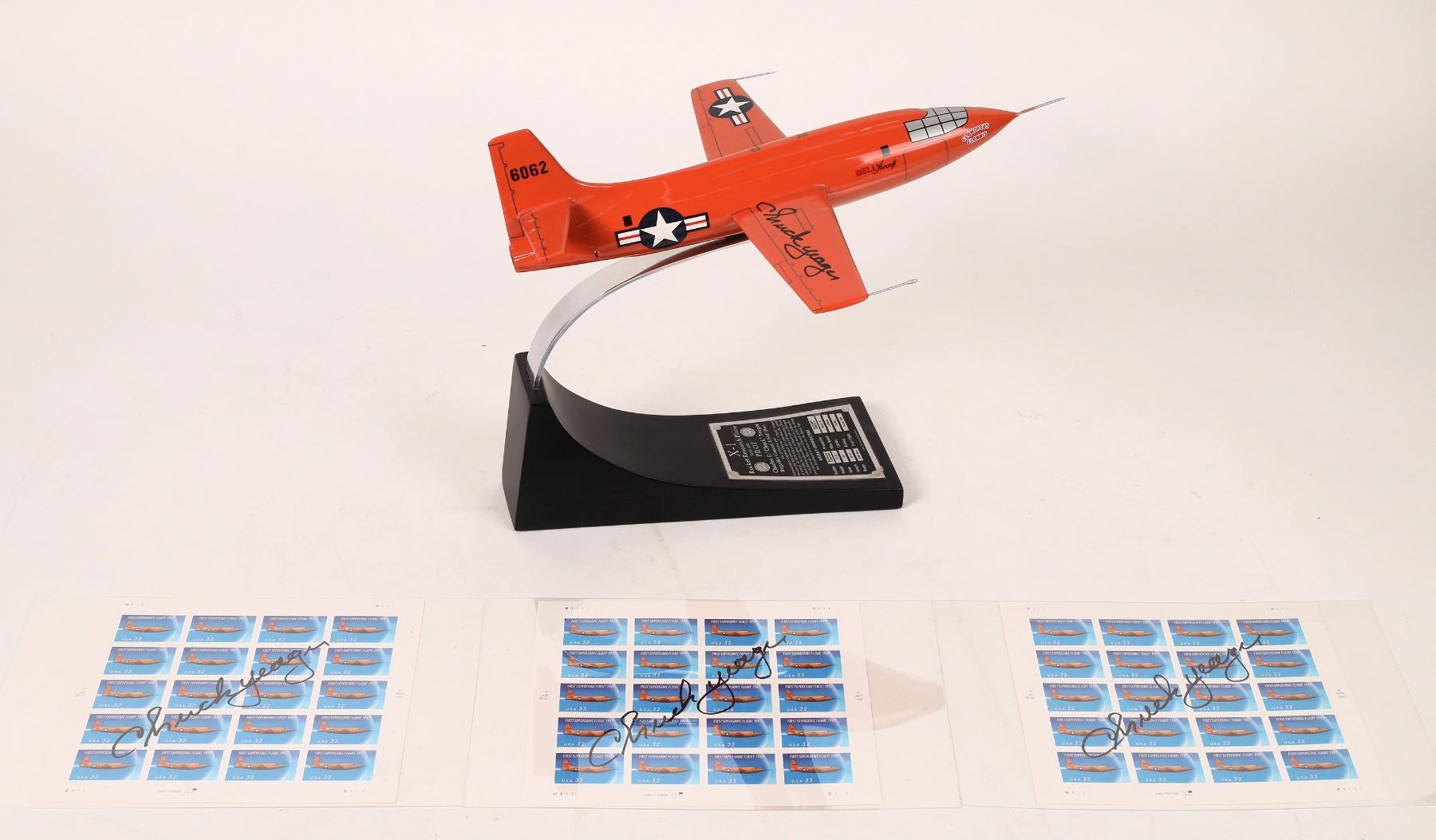 This lot will go fast! Chuck Yeager was the first pilot to go supersonic and break the sound barrier. Autographed on right wing of the Glamorous Glennis X-1 model which stands 10" tall. 3 sheets of autographed First Supersonic Flight US Stamps.