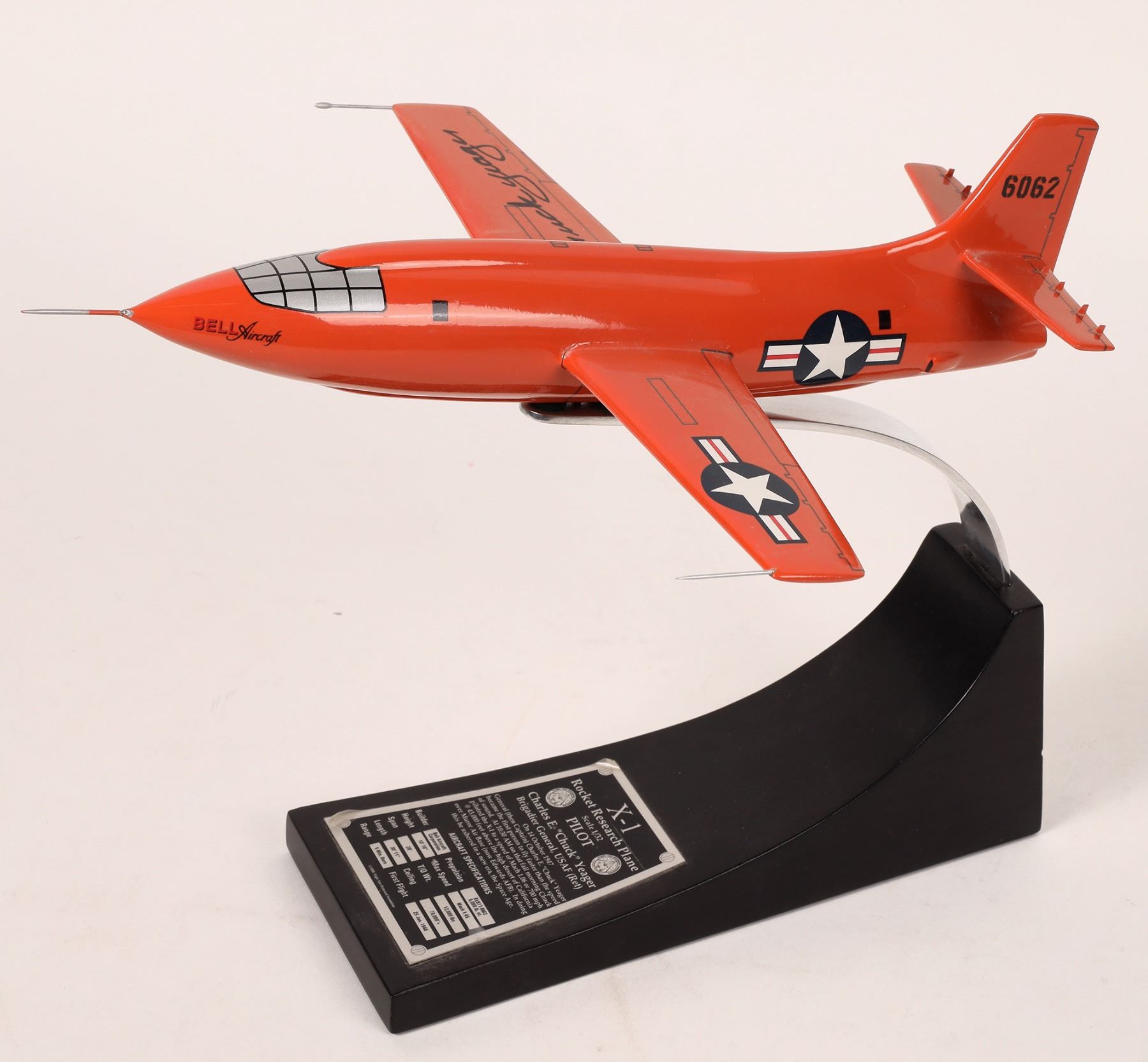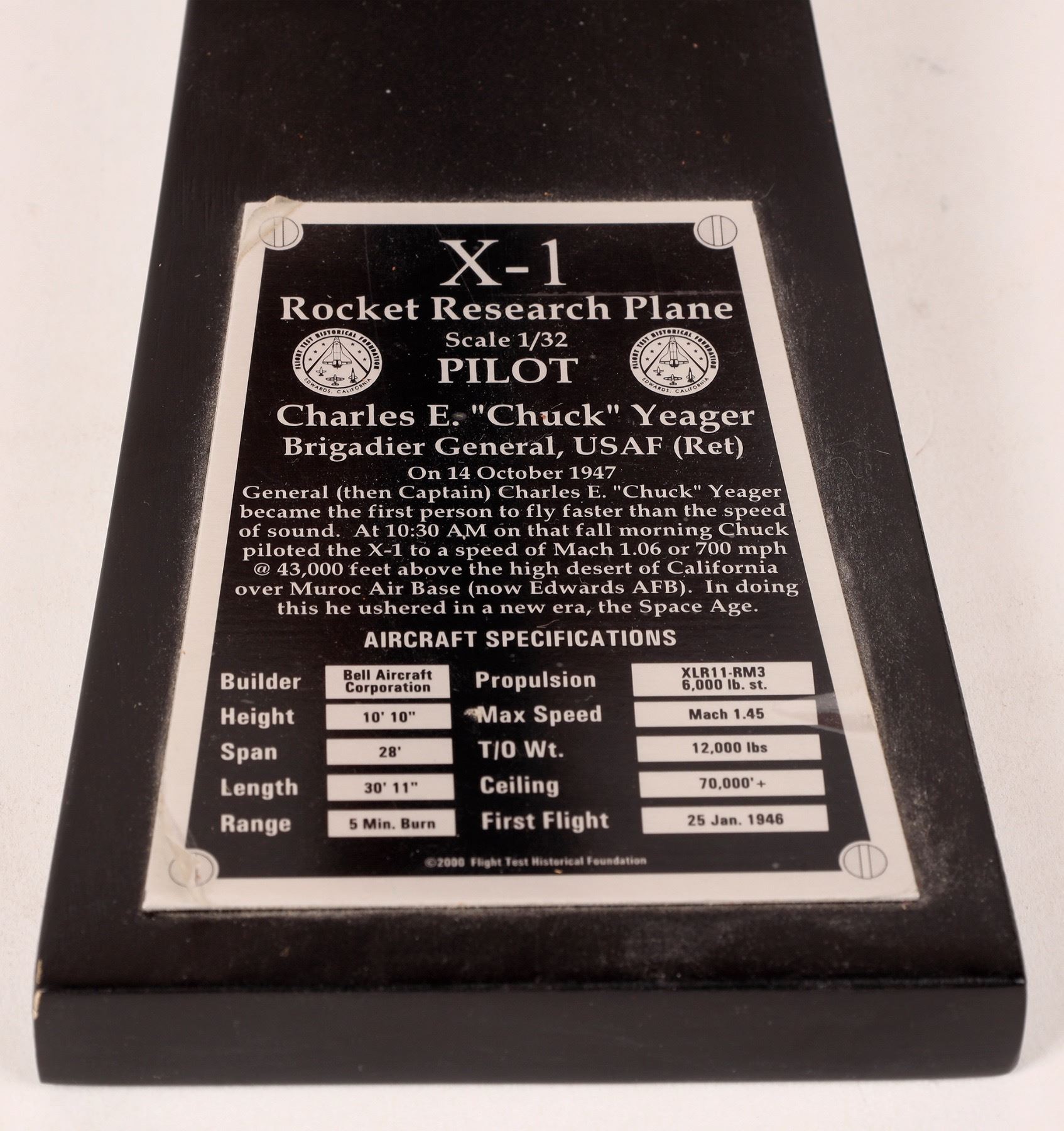 This lot will go fast! Chuck Yeager was the first pilot to go supersonic and break the sound barrier. Autographed on right wing of the Glamorous Glennis X-1 model which stands 10" tall. 3 sheets of autographed First Supersonic Flight US Stamps.