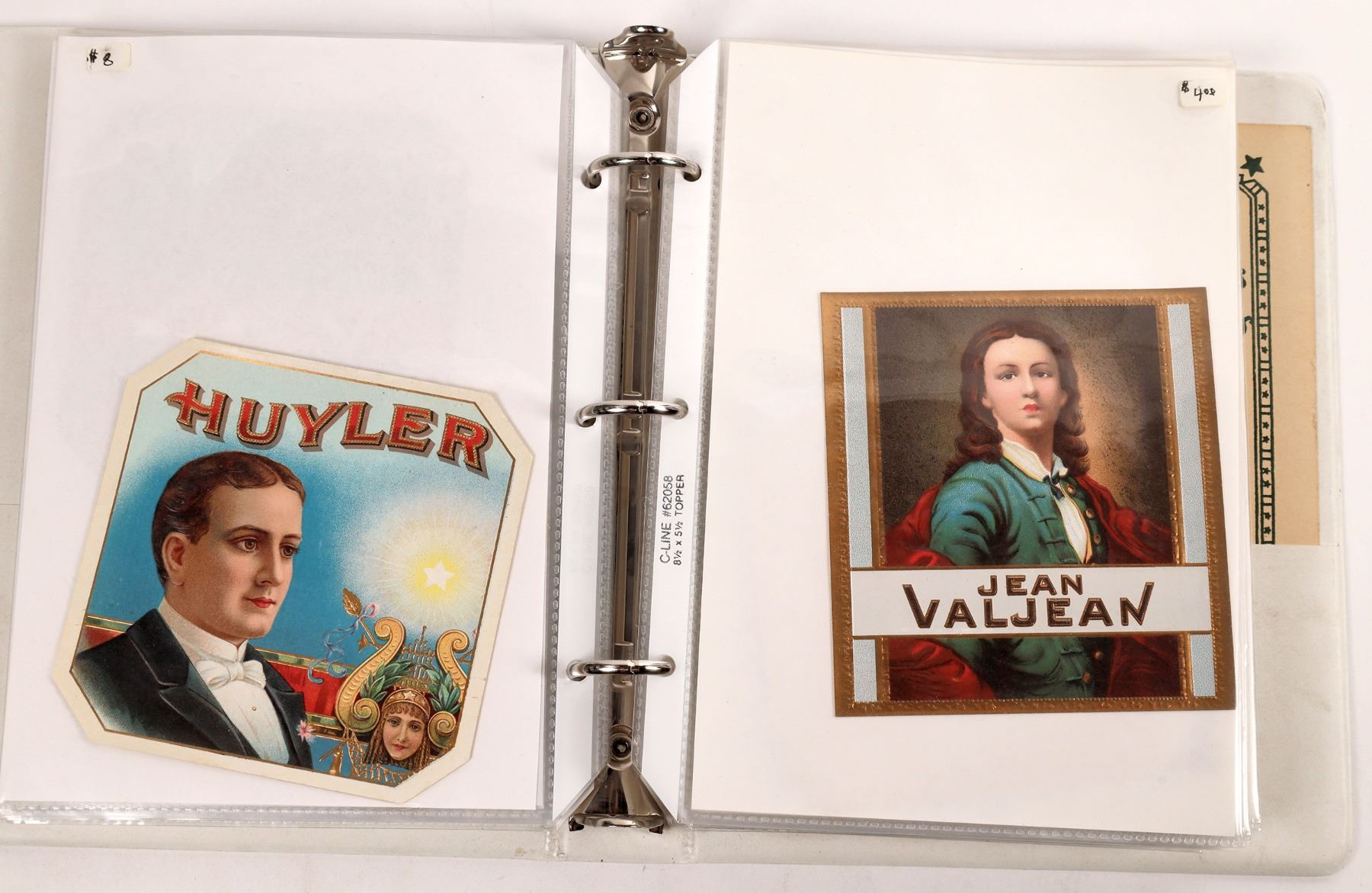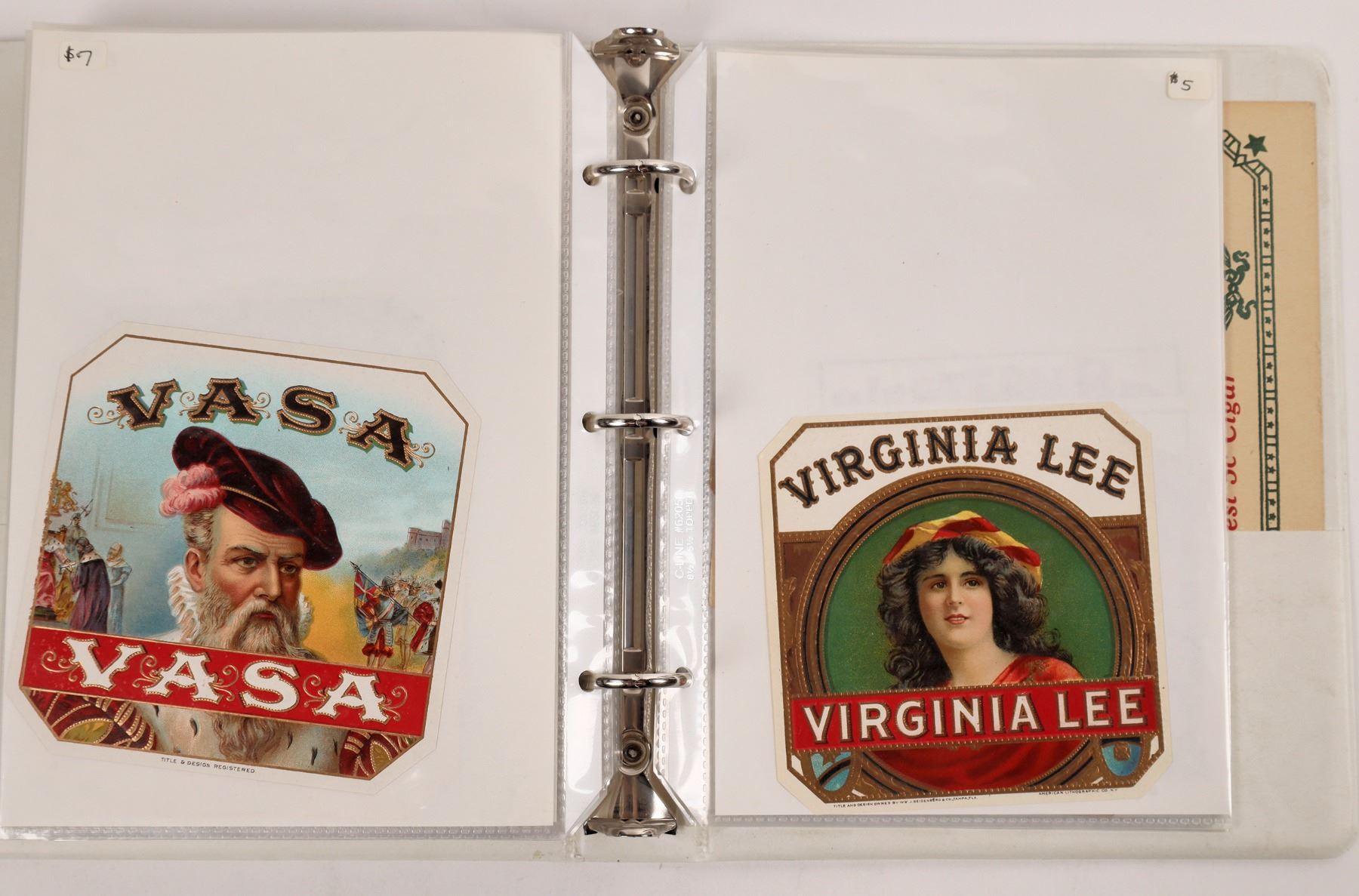 About 130 vintage smaller cigar box labels, approx. 4.5x4.5". Blue Bird, Ben Franklin, Calvano, Zev, Round Up, Seminola, Duo-Art etc. In binder.