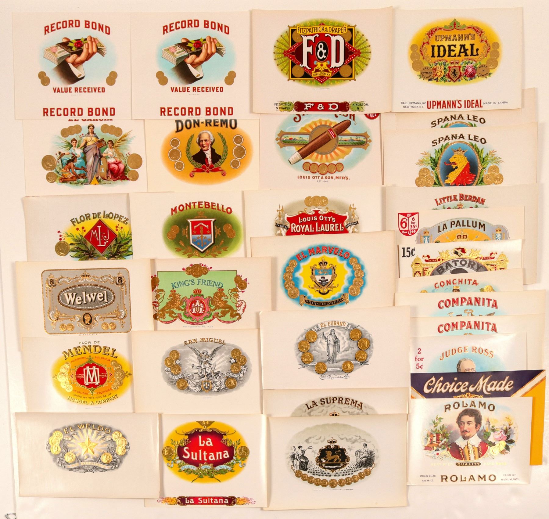 Here is a Gigantic Cigar Box label collection. It Includes: Apter's Don- Remo ( With Bust & Coins ), El Garcia ( With 4 Women & Coins), Silver Ash ( With Large Cigar ), Spano Leo ( With Crowned Lion & Coins ), Flor Del Lopez( With Monogram & Coins), Montebello ( With Shield It never stops..., Royal Laurel ( With Battle Axes & Coins ), and Little Berdan ( With Shields & Coins ). It just never stops..La Pallum ( With Shields & Sphinxes n Coins ), Batory ( With Bust & Coins ), El Marvelo ( With Shield & Coins ), and Conchita ( With Woman, Child & Coins). Plus, Companita ( With Angels,Coins, & Shield ), Flor De Mendel ( With Monogram & Coins ). Welwel ( With Crown & Coins ), Kings Friend( With Coins & Griffins ), Rolamo ( With Spanish Bust), Choice Made( With Tobacco Leaf ), Judge Ross ( With Bust, Coins, and Signed: N. Sanquit Rodo ). San Miguel ( With Coins, & Winged Angel, Stabbing Satan !! ), El Purano ( With a Blindfolded Justice Statue, Coins, and a Signature !! ), La Suprema ( With Women & Lion ). La Sultana ( Wit eagle & Coins ), El Weldo( With Gold Star & Coins ), Upmann's ( With Coins), F & D ( With Coins ), and lastly, Record Bond ( With A Hand , Holding A stack of Money). Outstanding collection, with great graphics.All like new, perfect condition, and printed in America. these need to be FRAMED & HUNG !! ( RH).